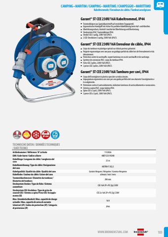 WWW.BRENNENSTUHL.COM 103CAMPING %u2022 MARITIM/CAMPING %u2022 MARITIME/CAMPEGGIO %u2022 MARITTIMOKabeltrommeln / Enrouleurs de c%u00e2bles/ Tamburi avvolgicavoCAMPING %u2022 MARITIM/CAMPING %u2022 MARITIME/CAMPEGGIO %u2022 MARITTIMOKabeltrommeln / Enrouleurs de c%u00e2bles/ Tamburi avvolgicavoGarant%u00ae ST CEE 230V/16A Kabeltrommel, IP44%u25a0 Trommelk%u00f6rper aus Spezialkunststoff auf verzinktem Tragegestell.%u25a0 Ergonomischer Handgriff mit Achse f%u00fcr perfekte Kabelf%u00fchrung beim Auf- und Abrollen.%u25a0 %u00dcberhitzungsschutz, Kontroll-Leuchte bei %u00dcberhitzung und %u00dcberlastung.%u25a0 Stecksystem IP67, Trommelk%u00f6rper IP44.%u25a0 Stecker CEE 3-polig, 230V/16A (IP67).%u25a0 2 CEE-Steckdosen 3-polig, 230V/16A (IP67).Garant%u00ae ST CEE 230V/16A Enrouleur de c%u00e2ble, IP44%u25a0 Corps du tambour en plastique sp%u00e9cial sur ch%u00e2ssis porteur galvanis%u00e9.%u25a0 Poign%u00e9e ergonomique avec axe pour un guidage parfait du c%u00e2ble lors de l%u2019enroulement et du d%u00e9roulement.%u25a0 Protection contre la surchauffe, voyant lumineux en cas de surchauffe et de surcharge.%u25a0 Syst%u00e8me de connexion IP67, corps du tambour IP44.%u25a0 Fiche CEE 3 p%u00f4les, 230V/16A (IP67).%u25a0 2 prises CEE 3 p%u00f4les, 230V/16A (IP67).Garant%u00ae ST CEE 230V/16A Tamburo per cavi, IP44%u25a0 Corpo dell%u2019avvolgitore in plastica speciale su telaio zincato.%u25a0 Impugnatura ergonomica con asse per una guida perfetta del cavo durante l%u2019avvolgimento e lo svolgimento.%u25a0 Protezione contro il surriscaldamento, indicatore luminoso di surriscaldamento e sovraccarico.%u25a0 Sistema a spina IP67, corpo bobina IP44.%u25a0 Spina CEE a 3 poli, 230V/16A (IP67).%u25a0 2 prese CEE a 3 poli, 230V/16A (IP67).ROBUSTSPECIALIP44 CEE 230 VCEE 230 VTECHNISCHE DATEN / DONN%u00c9ES TECHNIQUES / DATI TECNICIArtikelnummer/ R%u00e9f%u00e9rence / N%u00b0 articolo 1132826EAN/ Code-barre / Codice a Barre 4007123119240Kabell%u00e4nge / Longueur de c%u00e2ble / Lunghezza del cavo25 mKabelbezeichnung / Type de c%u00e2ble / Designazione del cavo H07RN-F 3G2,5Kabelqualit%u00e4t/ Qualit%u00e9 du c%u00e2ble / Qualit%u00e0 del cavo Gummi-Neopren / N%u00e9opr%u00e8ne/ Gomma-NeopreneKabelfarbe / Couleur du c%u00e2ble / Colore del cavo schwarz/ noir/ neroTrommeldurchmesser/ Diam%u00e8tre du tambour/ Diametro del tamburo 290 mmStecksystem Stecker/ Type de fiche / Sistema connettore CEE 16A 2P+PE (3p) 230VStecksystem CEE-Steckdose / Type de prise de courant CEE/ Sistema a spina Presa CEE/ Accoppiamento CEECEE 2x 16A 2P+PE (3p) 230VMax. Strombelastbarkeit/ Max. capacit%u00e9 de charge actuelle / Max. capacit%u00e0 di carico di corrente 16 ASchutzart (IP)/ Indice de protection (IP)/ Categoria di protezione (IP) IP44