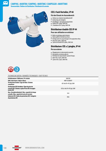 108 WWW.BRENNENSTUHL.COMCAMPING %u2022 MARITIM/CAMPING %u2022 MARITIME/CAMPEGGIO %u2022 MARITTIMOStromverteiler/ Bo%u00eetiers de Distribution / Distributori di correnteCAMPING %u2022 MARITIM/CAMPING %u2022 MARITIME/CAMPEGGIO %u2022 MARITTIMOStromverteiler/ Bo%u00eetiers de Distribution / Distributori di correnteCEE 2-fach Verteiler, IP 44F%u00fcr den Einsatz im Aussenbereich%u25a0 Geh%u00e4use aus robustem Spezialkunststoff.%u25a0 Hochwertig und schlagfest.%u25a0 Fremdk%u00f6rper- und spritzwassergesch%u00fctzt. %u25a0 Stecker CEE 3-polig, 230V/16A.%u25a0 2 Steckdosen CEE 3-polig, 230V/16ADistributeur double CEE IP 44Pour une utilisation en ext%u00e9rieur%u25a0 Bo%u00eetier en plastique sp%u00e9cial robuste.%u25a0 Haute qualit%u00e9 et r%u00e9sistant aux chocs.%u25a0 Prot%u00e9g%u00e9 contre les corps %u00e9trangers et les projections d%u2019eau.%u25a0 Fiche CEE 3 p%u00f4les, 230V/16A.%u25a0 2 prises de courant CEE 3 p%u00f4les, 230V/16ADistributore CEE a 2 pieghe, IP 44Per uso esterno%u25a0 Alloggiamento in robusta plastica speciale.%u25a0 Alta qualit%u00e0 e resistenza agli urti.%u25a0 Protezione da corpi estranei e spruzzi d%u2019acqua.%u25a0 Spina CEE a 3 poli, 230V/16A.%u25a0 2 prese CEE a 3 poli, 230V/16A.IP44CEECEE 230 VCEE 230 VTECHNISCHE DATEN / DONN%u00c9ES TECHNIQUES / DATI TECNICIArtikelnummer/ R%u00e9f%u00e9rence / N%u00b0 articolo 1081582EAN/ Code-barre / Codice a Barre 4007123286997Stecksystem Stecker/ Type de fiche / Sistema connettore CEE 16A 2P+PE (3p) 230VStecksystem CEE-Steckdose / Type de prise de courant CEE/ Sistema a spina Presa CEE/ Accoppiamento CEECEE 2x 16A 2P+PE (3p) 230VMax. Strombelastbarkeit/ Max. capacit%u00e9 de charge actuelle / Max. capacit%u00e0 di carico di corrente 16 ASchutzart (IP)/ Indice de protection (IP)/ Categoria di protezione (IP) IP44