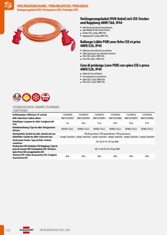114 WWW.BRENNENSTUHL.COMVERL%u00c4NGERUNGSKABEL/PROLONGATEURS/PROLUNGHEVerl%u00e4ngerungskabel (CEE)/ Prolongateurs (CEE)/ Prolonghe (CEE)VERL%u00c4NGERUNGSKABEL/PROLONGATEURS/PROLUNGHEVerl%u00e4ngerungskabel (CEE)/ Prolongateurs (CEE)/ Prolonghe (CEE)Verl%u00e4ngerungskabel (PUR-Kabel) mit CEE-Stecker und Kupplung 400V/16A, IP44%u25a0 Ideal f%u00fcr den Einsatz im Aussenbereich. %u25a0 Spezialkabel f%u00fcr den harten Einsatz. %u25a0 Stecker CEE 5-polig, 400V/16A.%u25a0 Kupplung CEE 5-polig, 400V/16A.Rallonge (c%u00e2ble PUR) avec fiche CEE et prise 400V/32A, IP44%u25a0 Id%u00e9al pour une utilisation en ext%u00e9rieur.%u25a0 C%u00e2ble sp%u00e9cial pour une utilisation intensive.%u25a0 Fiche CEE 5 p%u00f4les, 400V/32A.%u25a0 Prise CEE 5 p%u00f4les, 400V/32A.Cavo di prolunga (cavo PUR) con spina CEE e presa 400V/32A, IP44%u25a0 Ideale per l%u2019uso all%u2019aperto.%u25a0 Cavo speciale per uso intensivo.%u25a0 Spina CEE a 5 poli, 400V/32A.%u25a0 Presa CEE a 5 poli, 400V/32A.ROBUSTSPECIALIP44TECHNISCHE DATEN / DONN%u00c9ES TECHNIQUES / DATI TECNICIArtikelnummer/ R%u00e9f%u00e9rence / N%u00b0 articolo 1161940505 1161940510 1161940515 1161940520 1161940525 1161940530EAN/ Code-barre / Codice a Barre 4007123310937 4007123310944 4007123310951 4007123310968 4007123310975 4007123310982Kabell%u00e4nge / Longueur de c%u00e2ble / Lunghezza del cavo5 m 10 m 15 m 20 m 25 m 33 mKabelbezeichnung / Type de c%u00e2ble / Designazione del cavo H07BQ-F 5G2,5 H07BQ-F 5G2,5 H07BQ-F 5G2,5 H07BQ-F 5G2,5 H07BQ-F 5G2,5 H07BQ-F 5G2,5Kabelqualit%u00e4t/ Qualit%u00e9 du c%u00e2ble / Qualit%u00e0 del cavo PUR (Polyurethan)/ PUR (polyur%u00e9thane)/ PUR (poliuretano)Kabelfarbe / Couleur du c%u00e2ble / Colore del cavo orange/ arancione orange/ arancione orange/ arancione orange/ arancione orange/ arancione orange/ arancioneStecksystem Stecker/ Type de fiche / Sistema connettore CEE 16A 3P+N+PE (5p) 400VStecksystem CEE-Steckdose/ CEE-Kupplung / Type de prise de courant CEE/ Prolongateur CEE/ Sistema a spina Presa CEE/ accoppiamento CEECEE 1x 16A 3P+N+PE (5p) 400VSchutzart (IP)/ Indice de protection (IP)/ Categoria di protezione (IP) IP44 IP44 IP44 IP44 IP44 IP44