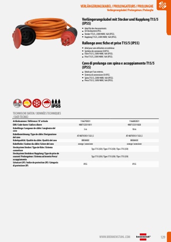 WWW.BRENNENSTUHL.COM 129VERL%u00c4NGERUNGSKABEL/PROLONGATEURS/PROLUNGHEVerl%u00e4ngerungskabel/ Prolongateurs/ ProlungheVERL%u00c4NGERUNGSKABEL/PROLONGATEURS/PROLUNGHEVerl%u00e4ngerungskabel/ Prolongateurs/ ProlungheVerl%u00e4ngerungskabel mit Stecker und Kupplung T15/5 (IP55)%u25a0 Ideal f%u00fcr den Ausseneinsatz.%u25a0 CH Stecksystem IP55.%u25a0 Stecker T15/5, 230V/400V, 16A (IP55).%u25a0 Kupplung T15/5, 230V/400V, 16A (IP55).Rallonge avec fiche et prise T15/5 (IP55)%u25a0 id%u00e9al pour une utilisation en ext%u00e9rieur.%u25a0 Syst%u00e8me de connexion CH IP55.%u25a0 Fiche T15/5, 230V/400V, 16A (IP55).%u25a0 Prise T15/5, 230V/400V, 16A (IP55).Cavo di prolunga con spina e accoppiamento T15/5 (IP55)%u25a0 Ideale per l%u2019uso esterno.%u25a0 Sistema di connessione CH IP55.%u25a0 Spina T15/5, 230V/400V, 16A (IP55).%u25a0 Presa T15/5, 230V/400V, 16A (IP55).ROBUSTSPECIALTECHNISCHE DATEN / DONN%u00c9ES TECHNIQUES / DATI TECNICIArtikelnummer/ R%u00e9f%u00e9rence / N%u00b0 articolo 1166792831 1166802831EAN/ Code-barre / Codice a Barre 4007123311811 4007123311828Kabell%u00e4nge / Longueur de c%u00e2ble / Lunghezza del cavo5 m 10 mKabelbezeichnung / Type de c%u00e2ble / Designazione del cavo AT-N07V3V3-F 5G1,5 AT-N07V3V3-F 5G1,5Kabelqualit%u00e4t/ Qualit%u00e9 du c%u00e2ble / Qualit%u00e0 del cavo BREMAXX BREMAXXKabelfarbe / Couleur du c%u00e2ble / Colore del cavo orange/ arancione orange/ arancioneStecksystem Stecker/ Type de fiche / Sistema connettore Typ J T15 (CH)/ Type J T15 (CH)/ Tipo J T15 (CH)Stecksystem Steckdose/ Kupplung / Type de prise de courant/ Prolongateur/ Sistema ad innesto Presa/ accoppiamentoTyp J T15 (CH)/ Type J T15 (CH)/ Tipo J T15 (CH)Schutzart (IP)/ Indice de protection (IP)/ Categoria di protezione (IP) IP55 IP55