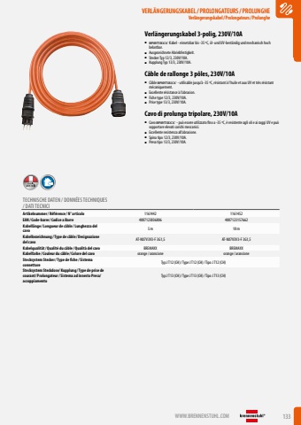 WWW.BRENNENSTUHL.COM 133VERL%u00c4NGERUNGSKABEL/PROLONGATEURS/PROLUNGHEVerl%u00e4ngerungskabel/ Prolongateurs/ ProlungheVERL%u00c4NGERUNGSKABEL/PROLONGATEURS/PROLUNGHEVerl%u00e4ngerungskabel/ Prolongateurs/ ProlungheVerl%u00e4ngerungskabel 3-polig, 230V/10A%u25a0%uf006%uf007%uf008 Kabel - einsetzbar bis -35 %u00baC, %u00f6l- und UV-best%u00e4ndig und mechanisch hoch belastbar.%u25a0 Ausgezeichnete Abriebfestigkeit.%u25a0 Stecker Typ 12/3, 230V/10A.%u25a0 Kupplung Typ 13/3, 230V/10A.C%u00e2ble de rallonge 3 p%u00f4les, 230V/10A%u25a0 C%u00e2ble %uf006%uf007%uf008 - utilisable jusqu%u2019%u00e0 -35 %u00baC, r%u00e9sistant %u00e0 l%u2019huile et aux UV et tr%u00e8s r%u00e9sistant m%u00e9caniquement.%u25a0 Excellente r%u00e9sistance %u00e0 l%u2019abrasion.%u25a0 Fiche type 12/3, 230V/10A.%u25a0 Prise type 13/3, 230V/10A.Cavo di prolunga tripolare, 230V/10A%u25a0 Cavo %uf006%uf007%uf008 - pu%u00f2 essere utilizzato fino a -35 %u00baC, %u00e8 resistente agli oli e ai raggi UV e pu%u00f2 sopportare elevati carichi meccanici.%u25a0 Eccellente resistenza all%u2019abrasione.%u25a0 Spina tipo 12/3, 230V/10A.%u25a0 Presa tipo 13/3, 230V/10A.TECHNISCHE DATEN / DONN%u00c9ES TECHNIQUES / DATI TECNICIArtikelnummer/ R%u00e9f%u00e9rence / N%u00b0 articolo 1161442 1161452EAN/ Code-barre / Codice a Barre 4007123036806 4007123157662Kabell%u00e4nge / Longueur de c%u00e2ble / Lunghezza del cavo5 m 10 mKabelbezeichnung / Type de c%u00e2ble / Designazione del cavo AT-N07V3V3-F 3G1,5 AT-N07V3V3-F 3G1,5Kabelqualit%u00e4t/ Qualit%u00e9 du c%u00e2ble / Qualit%u00e0 del cavo BREMAXX BREMAXXKabelfarbe / Couleur du c%u00e2ble / Colore del cavo orange/ arancione orange/ arancioneStecksystem Stecker/ Type de fiche / Sistema connettore Typ J T12 (CH)/ Type J T12 (CH)/ Tipo J T12 (CH)Stecksystem Steckdose/ Kupplung / Type de prise de courant/ Prolongateur/ Sistema ad innesto Presa/ accoppiamentoTyp J T13 (CH)/ Type J T13 (CH)/ Tipo J T13 (CH)
