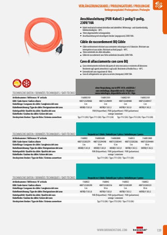 WWW.BRENNENSTUHL.COM 139VERL%u00c4NGERUNGSKABEL/PROLONGATEURS/PROLUNGHEVerl%u00e4ngerungskabel/ Prolongateurs/ ProlungheVERL%u00c4NGERUNGSKABEL/PROLONGATEURS/PROLUNGHEVerl%u00e4ngerungskabel/ Prolongateurs/ ProlungheAnschlussleitung (PUR-Kabel) 2-polig/3-polig, 230V/10A%u25a0 Kabel mechanisch extrem belastbar und abriebfest. Witterungs- und s%u00e4urebest%u00e4ndig. K%u00e4ltebest%u00e4ndig bis - 40%u00b0C. %u25a0 10cm abgemantelte Leitungsenden. %u25a0 Anschlussleitung mit einseitigem Stecker (angegossen) 230V/10A.C%u00e2ble de raccordement BQ C%u00e2ble%u25a0 C%u00e2ble extr%u00eamement r%u00e9sistant aux contraintes m%u00e9caniques et %u00e0 l%u2019abrasion. R%u00e9sistant aux intemp%u00e9ries et aux acides. R%u00e9sistant au froid jusqu%u2019%u00e0 - 40%u00b0C. %u25a0 10cm extr%u00e9mit%u00e9s de c%u00e2ble d%u00e9nud%u00e9es. %u25a0 C%u00e2ble de raccordement avec fiche unilat%u00e9rale (moul%u00e9e) 230V/10A.Cavo di allacciamento con cavo BQ%u25a0 Cavo estremamente resiliente dal punto di vista meccanico e resistente all%u2019abrasione. Resistente agli agenti atmosferici e agli acidi. Resistente al freddo fino a - 40%u00b0C. %u25a0 Estremit%u00e0 del cavo inguainate di 10cm. %u25a0 Cavo di collegamento con spina su un lato (stampata) 230V/10A.ROBUSTSPECIALTECHNISCHE DATEN / DONN%u00c9ES TECHNIQUES / DATI TECNICIohne Verpackung, nur in VPE 10 St. erh%u00e4ltlich / sans emballage, disponible en U.I. 10 pi%u00e8ces / senza imballagio, disponibilie solo in U.I. 10pz.Artikelnummer/ R%u00e9f%u00e9rence / N%u00b0 articolo 1160002101 1160012101 1160022101 1160032101EAN/ Code-barre / Codice a Barre 4007123290482 4007123290499 4007123289400 4007123289417Kabell%u00e4nge / Longueur de c%u00e2ble / Lunghezza del cavo 5 m 5 m 5 m 5 mKabelbezeichnung / Type de c%u00e2ble / Designazione del cavo H05BQ-F 2G1,0 H07BQ-F 2G1,5 H07BQ-F 3G1,0 H07BQ-F 3G1,5Kabelqualit%u00e4t/ Qualit%u00e9 du c%u00e2ble / Qualit%u00e0 del cavo PUR (Polyurethan)/ PUR (polyur%u00e9thane)/ PUR (poliuretano)Kabelfarbe / Couleur du c%u00e2ble / Colore del cavo orange/ arancioneStecksystem Stecker/ Type de fiche / Sistema connettore Typ J T11 (CH)/ Type J T11 (CH)/ Tipo J T11 (CH) Typ J T12 (CH)/ Type J T12 (CH)/ Tipo J T12 (CH)TECHNISCHE DATEN / DONN%u00c9ES TECHNIQUES / DATI TECNICI Verpackt zu 1 St%u00fcck / Emball%u00e9 par 1 pi%u00e8ce / Imballato per 1 pezzoArtikelnummer/ R%u00e9f%u00e9rence / N%u00b0 articolo 1160002 1160002600 1160002800 1160012 1160012800EAN/ Code-barre / Codice a Barre 4007123283279 4007123294398 4007123303441 4007123283286 4007123294404Kabell%u00e4nge / Longueur de c%u00e2ble / Lunghezza del cavo 5 m 10 m 15 m 5 m 10 mKabelbezeichnung / Type de c%u00e2ble / Designazione del cavo H05BQ-F 2G1,0 H05BQ-F 2G1,0 H05BQ-F 2G1,0 H07BQ-F 2G1,5 H07BQ-F 2G1,5Kabelqualit%u00e4t/ Qualit%u00e9 du c%u00e2ble / Qualit%u00e0 del cavo PUR (Polyurethan)/ PUR (polyur%u00e9thane)/ PUR (poliuretano)Kabelfarbe / Couleur du c%u00e2ble / Colore del cavo orange/ arancioneStecksystem Stecker/ Type de fiche / Sistema connettore Typ J T11 (CH)/ Type J T11 (CH)/ Tipo J T11 (CH)TECHNISCHE DATEN / DONN%u00c9ES TECHNIQUES / DATI TECNICI Verpackt zu 1 St%u00fcck / Emball%u00e9 par 1 pi%u00e8ce / Imballato per 1 pezzoArtikelnummer/ R%u00e9f%u00e9rence / N%u00b0 articolo 1160022 1160042 1160032 1160052EAN/ Code-barre / Codice a Barre 4007123283293 4007123283316 4007123283309 4007123283323Kabell%u00e4nge / Longueur de c%u00e2ble / Lunghezza del cavo 5 m 10 m 5 m 10 mKabelbezeichnung / Type de c%u00e2ble / Designazione del cavo H07BQ-F 3G1,0 H07BQ-F 3G1,0 H07BQ-F 3G1,5 H07BQ-F 3G1,5Kabelqualit%u00e4t/ Qualit%u00e9 du c%u00e2ble / Qualit%u00e0 del cavo PUR (Polyurethan)/ PUR (polyur%u00e9thane)/ PUR (poliuretano)Kabelfarbe / Couleur du c%u00e2ble / Colore del cavo orange/ arancioneStecksystem Stecker/ Type de fiche / Sistema connettore Typ J T12 (CH)/ Type J T12 (CH)/ Tipo J T12 (CH)