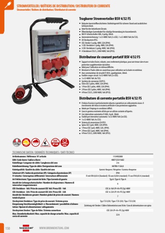 150 WWW.BRENNENSTUHL.COMSTROMVERTEILER / BO%u00ceTIERS DE DISTRIBUTION / DISTRIBUTORI DI CORRENTEStromverteiler/ Bo%u00eetiers de distribution / Distributori di correnteSTROMVERTEILER / BO%u00ceTIERS DE DISTRIBUTION / DISTRIBUTORI DI CORRENTEStromverteiler/ Bo%u00eetiers de distribution / Distributori di correnteTragbarer Stromverteiler BSV 4/32 FS%u25a0 Robustes kunststoffbeschichtetes Stahlrohrgestell f%u00fcr sicheren Stand und zus%u00e4tzlichen Geh%u00e4useschutz.%u25a0 Ideal f%u00fcr den belastbaren Einsatz.%u25a0 %u00d6lbest%u00e4ndiges Gummikabel f%u00fcr st%u00e4ndige Verwendung im Aussenbereich.%u25a0 Mit FI-Schutzschalter 40A, 4-polig, 30mA.%u25a0 Automatensicherung: 1 x LS 400V/16A (2 x CEE). 1 x LS 400V/16A (4x T25).%u25a0 CH Stecksystem IP55.%u25a0 CEE-Stecker 5-polig, 400V, 32A (IP44).%u25a0 1 CEE-Steckdose 5-polig, 400V, 32A (IP44).%u25a0 2 CEE-Steckdosen 5-polig, 400V, 16A (IP44).%u25a0 4 Steckdosen T25/5, 230V/400V, 16A (IP55).Distributeur de courant portatif BSV 4/32 FS%u25a0 Support en tube d%u2019acier, robuste, avec rev%u00eatement plastique, pour une tenue s%u00fbre et une protection suppl%u00e9mentaire du bo%u00eetier.%u25a0 Id%u00e9al pour l%u2019utilisation en milieux difficiles.%u25a0 R%u00e9sistant %u00e0 l%u2019huile c%u00e2ble en caoutchouc pour utilisation sur la dur%u00e9e en ext%u00e9rieur.%u25a0 Avec commutateur de s%u00e9curit%u00e9 FI 40 A, quadripolaire, 30mA.%u25a0 Fusibles coupe-circuit: 1x LS 400V/16A (2 x CEE).%u25a0 1 x LS 400V/16A (4x T25)%u25a0 Syst%u00e8me de connexion CH IP55.%u25a0 Fiche CEE 5 p%u00f4les, 400V, 32A (IP44).%u25a0 1 Prise CEE 5 p%u00f4les, 400V, 32A (IP44).%u25a0 2 Prises CEE 5 p%u00f4les, 400V, 16A (IP44).%u25a0 4 Prises T25/5, 230V/400V, 16A (IP55).Distributore di corrente portatile BSV 4/32 FS%u25a0 Il telaio d%u2019acciaio %u00e8 particolarmente robusto e garantisce un collocamento sicuro. Il rivestimento del telaio in materia artificiale %u00e8 una protezione aggiuntiva.%u25a0 Ideale per l%u2019impiego in condizioni difficil.%u25a0 Cavo in gomma resistente all%u2019olio per un ulilizzo costante all%u2019aperto.%u25a0 Con interruttore automatico FI 40A, 4 poli, 30mA.%u25a0 Fusibili per interruttori automatici: 1x LS 400V/16A (2x CEE).%u25a0 1 x LS 400V/16A (4 x T25) %u25a0 Sistema di connessione CH IP55.%u25a0 Spina CEE 5 poli, 400V, 32A (IP44).%u25a0 1 Presa CEE 5 poli, 400V, 32A, (IP44).%u25a0 2 Prese CEE 5 poli, 400V, 16A (IP44).%u25a0 4 Prese T25/5, 230V/400V, 16A (IP55).ROBUSTSPECIALFI-SAFETY IP44CEECH/T25IP55TECHNISCHE DATEN / DONN%u00c9ES TECHNIQUES / DATI TECNICIArtikelnummer/ R%u00e9f%u00e9rence / N%u00b0 articolo 1154902800EAN/ Code-barre / Codice a Barre 4007123311682Kabell%u00e4nge / Longueur de c%u00e2ble / Lunghezza del cavo 2 mKabelbezeichnung / Type de c%u00e2ble / Designazione del cavo H07RN-F 5G4,0Kabelqualit%u00e4t/ Qualit%u00e9 du c%u00e2ble / Qualit%u00e0 del cavo Gummi-Neopren / N%u00e9opr%u00e8ne/ Gomma-NeopreneSchutzart (IP)/ Indice de protection (IP)/ Categoria di protezione (IP) IP44FI-Schalter/ Interrupteur diff%u00e9rentiel/ Interruttore differenziale FI mit IFN 0,03 A (Standard)/ ID avec 0,03A (standard)/ FI con IFN 0,03 A (standard)Art Fehlerstrom/ Type courant de fuite / Tipo Corrente di guasto Typ A / Type A / Tipo AAnzahl der Leitungsschutzschalter/ Nombre de disjoncteurs/ Numero di interruttori magnetotermici 6CEE-Steckdose - 16A / Prise de courant CEE 16A / Presa CEE - 16A CEE 2x 16A 3P+N+PE (5p) 400VCEE-Steckdose - 32A / Prise de courant CEE 32A / Presa CEE - 32A CEE 1x 32A 3P+N+PE (5p) 400VAnzahl der Steckdosen gesamt/ Nombre global de prises de courant/ Numero totale di prese 7Stecksystem Steckdose / Type de prise de courant/ Sistema presa Typ J T25 (CH)/ Type J T25 (CH)/ Tipo J T25 (CH)Einspeisung/ Anschlussm%u00f6glichkeit- e / Raccordement / possibilit%u00e9s d%u2019alimentation / Opzioni di alimentazione/ collegamento Zuleitung mit Stecker/ C%u00e2ble d%u2019alimentation avec fiche/ Cavo di alimentazione con spinaStecksystem Stecker/ Type de fiche / Sistema connettore CEE 32A 3P+N+PE (5p) 400VMax. Strombelastbarkeit/ Max. capacit%u00e9 de charge actuelle / Max. capacit%u00e0 di carico di corrente 32 A