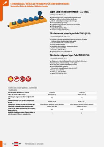 160 WWW.BRENNENSTUHL.COMSTROMVERTEILER / BO%u00ceTIERS DE DISTRIBUTION / DISTRIBUTORI DI CORRENTEStromverteiler/ Bo%u00eetiers de distribution / Distributori di correnteSTROMVERTEILER / BO%u00ceTIERS DE DISTRIBUTION / DISTRIBUTORI DI CORRENTEStromverteiler/ Bo%u00eetiers de distribution / Distributori di correnteSuper-Solid Steckdosenverteiler T13/3 (IP55)*Verf%u00fcgbar ab M%u00e4rz 2023*%u25a0 Ein hochwertiges, schlag- und bruchfestes Kunststoffgeh%u00e4use.%u25a0 Elegantes, schlankes, zeitloses, hochwertiges Design.%u25a0 Mit sehr stabilem B%u00fcgel zum H%u00e4ngen oder Befestigen.%u25a0 Innovatives Befestigungskonzept.%u25a0 Sicherheitsschalter beleuchtet, zweipolig ein-/ausschaltbar.%u25a0 CH Stecksystem IP55.%u25a0 Stecker T13/3, 230V/10A (IP55).%u25a0 5 Steckdosen T13/3, 230V/10A (IP55).Distributeur de prises Super-Solid T13/3 (IP55)*Disponible %u00e0 partir de mars 2023*%u25a0 Un bo%u00eetier en plastique de haute qualit%u00e9, r%u00e9sistant aux chocs et %u00e0 la rupture.%u25a0 Un design %u00e9l%u00e9gant, %u00e9lanc%u00e9, intemporel et de qualit%u00e9.%u25a0 Avec un %u00e9trier tr%u00e8s stable %u00e0 suspendre ou %u00e0 fixer.%u25a0 Concept de fixation innovant.%u25a0 Interrupteur de s%u00e9curit%u00e9 %u00e9clair%u00e9, bipolaire marche/arr%u00eat.%u25a0 Syst%u00e8me de connexion CH IP55.%u25a0 Fiche T13/3, 230V/10A (IP55).%u25a0 5 prises de courant T13/3, 230V/10A (IP55).Distributore di prese Super-Solid T13/3 (IP55)*Disponibile da marzo 2023*%u25a0 Alloggiamento in plastica di alta qualit%u00e0, resistente agli urti e alla rottura.%u25a0 Design elegante, sottile, senza tempo e di alta qualit%u00e0.%u25a0 Con staffa molto stabile per essere appesa o montata.%u25a0 Concetto di montaggio innovativo.%u25a0 Interruttore di sicurezza illuminato, a due poli on/off.%u25a0 Sistema a innesto CH IP55.%u25a0 Spina T13/3, 230V/10A (IP55).%u25a0 5 prese T13/3, 230V/10A (IP55).ROBUSTSPECIALCH/T13IP55TECHNISCHE DATEN / DONN%u00c9ES TECHNIQUES / DATI TECNICIArtikelnummer/ R%u00e9f%u00e9rence / N%u00b0 articolo 1159902305 1159902505EAN/ Code-barre / Codice a Barre 4007123310173 4007123311538Kabell%u00e4nge / Longueur de c%u00e2ble / Lunghezza del cavo3 m 5 mKabelbezeichnung / Type de c%u00e2ble / Designazione del cavo H05RN-F 3G1,0 H07RN-F 3G1,5Kabelqualit%u00e4t/ Qualit%u00e9 du c%u00e2ble / Qualit%u00e0 del cavo Gummi-Neopren / N%u00e9opr%u00e8ne/ Gomma-Neoprene Gummi-Neopren / N%u00e9opr%u00e8ne/ Gomma-NeopreneKabelfarbe / Couleur du c%u00e2ble / Colore del cavo schwarz/ noir/ nero schwarz/ noir/ neroSchutzart (IP)/ Indice de protection (IP)/ Categoria di protezione (IP) IP55 IP55Anzahl der Steckdosen gesamt/ Nombre global de prises de courant/ Numero totale di prese 5 5