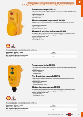 WWW.BRENNENSTUHL.COM 163STROMVERTEILER / BO%u00ceTIERS DE DISTRIBUTION / DISTRIBUTORI DI CORRENTEStecker, Kupplungen & Steckdoseneins%u00e4tze/ Fiches, raccords & inserts de prise/ Spine, prese e inserti a bicchiereSTROMVERTEILER / BO%u00ceTIERS DE DISTRIBUTION / DISTRIBUTORI DI CORRENTEStecker, Kupplungen & Steckdoseneins%u00e4tze/ Fiches, raccords & inserts de prise/ Spine, prese e inserti a bicchierePersonenschutz-Adapter BDI-A 30%u25a0 Der wirksame Schutz gegen Stromunf%u00e4lle. Trennt blitzschnell die aktiven Leiter vom Netz, sobald Differenzstr%u00f6me auftreten.%u25a0 Nenndifferenzstrom: 30 mA.%u25a0 Zweipolige Abschaltung.%u25a0 Ausl%u00f6sezeit: <30 ms.Adaptateur de protection personnelle BDI-A 30%u25a0 Protection efficace contre les accidents %u00e9lectriques. Coupe instantan%u00e9ment l%u2019alimentation %u00e9lectrique lors de courants de fuite.%u25a0 Courant diff%u00e9rentiel nominal 30mA.%u25a0 D%u00e9connexion bipolaire.%u25a0 Temps de d%u00e9clenchement: <30 ms.Adattatore di protezione per la persona BDI-A 30%u25a0 La protezione efficace contro incidenti con la corrente elettrica. Stacca dalla rete in modo fulmineo i conduttori attivi e il conduttore di protezione non appena sopraggiungono correnti differenziali.%u25a0 Corrente differenziale nominale: 30 mA.%u25a0 Spegnimento bipolare.%u25a0 Tempo di apertura: <30 ms.ROBUSTSPECIALFI-SAFETYTECHNISCHE DATEN / DONN%u00c9ES TECHNIQUES / DATI TECNICIArtikelnummer/ R%u00e9f%u00e9rence / N%u00b0 articolo 1290642EAN/ Code-barre / Codice a Barre 4007123593811Max. Strombelastbarkeit/ Max. capacit%u00e9 de charge actuelle / Max. capacit%u00e0 di carico di corrente 10 APersonenschutz-Stecker BDI-S 30%u25a0 Der wirksame Schutz gegen Stromunf%u00e4lle. Trennt blitzschnell die aktiven Leiter vom Netz, sobald Differenzstr%u00f6me auftreten.%u25a0 Nenndifferenzstrom: 30 mA.%u25a0 Zweipolige Abschaltung.%u25a0 Ausl%u00f6sezeit: <30 ms.Prise de protection personnelle BDI-S 30%u25a0 Protection efficace contre les accidents %u00e9lectriques. Coupe instantan%u00e9ment l%u2019alimentation %u00e9lectrique lors de courants de fuite.%u25a0 Courant diff%u00e9rentiel nominal 30mA.%u25a0 D%u00e9connexion bipolaire.%u25a0 Temps de d%u00e9clenchement: <30 ms.Adattore di protezione persone BDI-S 30%u25a0 La protezione efficace contro incidenti con la corrente elettrica. Stacca dalla rete in modo fulmineo i conduttori attivi e il conduttore di protezione non appena sopraggiungono correnti differenziali.%u25a0 Corrente differenziale nominale: 30 mA.%u25a0 Spegnimento bipolare.%u25a0 Tempo di apertura: <30 ms.ROBUSTSPECIALFI-SAFETYTECHNISCHE DATEN / DONN%u00c9ES TECHNIQUES / DATI TECNICIArtikelnummer/ R%u00e9f%u00e9rence / N%u00b0 articolo 1290632EAN/ Code-barre / Codice a Barre 4007123593798Max. Strombelastbarkeit/ Max. capacit%u00e9 de charge actuelle / Max. capacit%u00e0 di carico di corrente 10 A