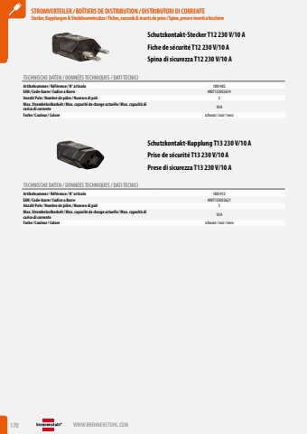 170 WWW.BRENNENSTUHL.COMSTROMVERTEILER / BO%u00ceTIERS DE DISTRIBUTION / DISTRIBUTORI DI CORRENTEStecker, Kupplungen & Steckdoseneins%u00e4tze/ Fiches, raccords & inserts de prise/ Spine, prese e inserti a bicchiereSTROMVERTEILER / BO%u00ceTIERS DE DISTRIBUTION / DISTRIBUTORI DI CORRENTEStecker, Kupplungen & Steckdoseneins%u00e4tze/ Fiches, raccords & inserts de prise/ Spine, prese e inserti a bicchiereSchutzkontakt-Stecker T12 230 V/10 AFiche de s%u00e9curit%u00e9 T12 230 V/10 ASpina di sicurezza T12 230 V/10 ATECHNISCHE DATEN / DONN%u00c9ES TECHNIQUES / DATI TECNICIArtikelnummer/ R%u00e9f%u00e9rence / N%u00b0 articolo 1081402EAN/ Code-barre / Codice a Barre 4007123033614Anzahl Pole / Nombre de p%u00f4les/ Numero di poli 3Max. Strombelastbarkeit/ Max. capacit%u00e9 de charge actuelle / Max. capacit%u00e0 di carico di corrente 10 AFarbe / Couleur/ Colore schwarz/ noir/ neroSchutzkontakt-Kupplung T13 230 V/10 APrise de s%u00e9curit%u00e9 T13 230 V/10 APrese di sicurezza T13 230 V/10 ATECHNISCHE DATEN / DONN%u00c9ES TECHNIQUES / DATI TECNICIArtikelnummer/ R%u00e9f%u00e9rence / N%u00b0 articolo 1081412EAN/ Code-barre / Codice a Barre 4007123033621Anzahl Pole / Nombre de p%u00f4les/ Numero di poli 3Max. Strombelastbarkeit/ Max. capacit%u00e9 de charge actuelle / Max. capacit%u00e0 di carico di corrente 10 AFarbe / Couleur/ Colore schwarz/ noir/ nero