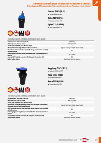 WWW.BRENNENSTUHL.COM 171STROMVERTEILER / BO%u00ceTIERS DE DISTRIBUTION / DISTRIBUTORI DI CORRENTEStecker, Kupplungen & Steckdoseneins%u00e4tze/ Fiches, raccords & inserts de prise/ Spine, prese e inserti a bicchiereSTROMVERTEILER / BO%u00ceTIERS DE DISTRIBUTION / DISTRIBUTORI DI CORRENTEStecker, Kupplungen & Steckdoseneins%u00e4tze/ Fiches, raccords & inserts de prise/ Spine, prese e inserti a bicchiereStecker T23/3 (IP55)%u25a0 Stecker mit Schutzart IP55.Fiche T23/3 (IP55)%u25a0 Fiche avec protection IP55.Spina T23/3 (IP55)%u25a0 Spina con protezione IP 55.ROBUSTSPECIALCH/T23IP55TECHNISCHE DATEN / DONN%u00c9ES TECHNIQUES / DATI TECNICIArtikelnummer/ R%u00e9f%u00e9rence / N%u00b0 articolo 1082042055EAN/ Code-barre / Codice a Barre 4007123310401Anzahl Pole / Nombre de p%u00f4les/ Numero di poli 3Stecksystem Stecker/ Type de fiche / Sistema connettore Typ J T23 (CH)/ Type J T23 (CH)/ Tipo J T23 (CH)Max. Strombelastbarkeit/ Max. capacit%u00e9 de charge actuelle / Max. capacit%u00e0 di carico di corrente 16 ANenneingangsspannung / Tension nominale d%u2019entr%u00e9e / Tensione nominale di ingresso 250 V / 250 V~Schutzart (IP)/ Indice de protection (IP)/ Categoria di protezione (IP) IP55Farbe / Couleur/ Colore blau/schwarz/ bleu/noir/ blu/neroKupplung T23/3 (IP55)%u25a0 Kupplung mit Schutzart IP55.Prise T23/3 (IP55)%u25a0 Prise avec protection IP55.Presa T23/3 (IP55)%u25a0 Presa con protezione IP55.ROBUSTSPECIALCH/T23IP55TECHNISCHE DATEN / DONN%u00c9ES TECHNIQUES / DATI TECNICIArtikelnummer/ R%u00e9f%u00e9rence / N%u00b0 articolo 1082052055EAN/ Code-barre / Codice a Barre 4007123310418Anzahl Pole / Nombre de p%u00f4les/ Numero di poli 3Stecksystem Steckdose/ Kupplung / Type de prise de courant/ Prolongateur/ Sistema ad innesto Presa/ accoppiamento Typ J T23 (CH)/ Type J T23 (CH)/ Tipo J T23 (CH)Max. Strombelastbarkeit/ Max. capacit%u00e9 de charge actuelle / Max. capacit%u00e0 di carico di corrente 16 ANenneingangsspannung / Tension nominale d%u2019entr%u00e9e / Tensione nominale di ingresso 250 V / 250 V~Schutzart (IP)/ Indice de protection (IP)/ Categoria di protezione (IP) IP55Farbe / Couleur/ Colore blau/schwarz/ bleu/noir/ blu/nero