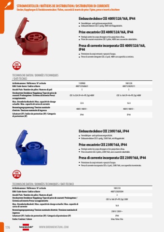 176 WWW.BRENNENSTUHL.COMSTROMVERTEILER / BO%u00ceTIERS DE DISTRIBUTION / DISTRIBUTORI DI CORRENTEStecker, Kupplungen & Steckdoseneins%u00e4tze/ Fiches, raccords & inserts de prise/ Spine, prese e inserti a bicchiereSTROMVERTEILER / BO%u00ceTIERS DE DISTRIBUTION / DISTRIBUTORI DI CORRENTEStecker, Kupplungen & Steckdoseneins%u00e4tze/ Fiches, raccords & inserts de prise/ Spine, prese e inserti a bicchiereEinbausteckdose CEE 400V/32A/16A, IP44%u25a0 Fremdk%u00f6rper- und spritzwassergesch%u00fctzt.%u25a0 Einbausteckdosen CEE 5-polig, 400V mit Klappdeckeln.Prise encastr%u00e9e CEE 400V/32A/16A, IP44%u25a0 Prot%u00e9g%u00e9 contre les corps %u00e9trangers et les projections d%u2019eau.%u25a0 Prises de courant encastr%u00e9es CEE 5 p%u00f4les, 400V avec couvercles rabattables.Presa di corrente incorporata CEE 400V/32A/16A, IP44%u25a0 Protezione da corpi estranei e spruzzi d%u2019acqua.%u25a0 Prese di corrente integrate CEE a 5 poli, 400V con coperchio a cerniera.IP44CEETECHNISCHE DATEN / DONN%u00c9ES TECHNIQUES / DATI TECNICIArtikelnummer/ R%u00e9f%u00e9rence / N%u00b0 articolo 1109980 1081220EAN/ Code-barre / Codice a Barre 4007123160631 4007123029211Anzahl Pole / Nombre de p%u00f4les/ Numero di poli 5 5Stecksystem Steckdose/ Kupplung / Type de prise de courant/ Prolongateur/ Sistema ad innesto Presa/ accoppiamentoCEE 1x 32A 3P+N+PE (5p) 400V CEE 1x 16A 3P+N+PE (5p) 400VMax. Strombelastbarkeit/ Max. capacit%u00e9 de charge actuelle / Max. capacit%u00e0 di carico di corrente 32 A 16 ANenneingangsspannung / Tension nominale d%u2019entr%u00e9e / Tensione nominale di ingresso 400 V / 400 V~ 400 V / 400 V~Schutzart (IP)/ Indice de protection (IP)/ Categoria di protezione (IP) IP44 IP44Einbausteckdose CEE 230V/16A, IP44%u25a0 Fremdk%u00f6rper- und spritzwassergesch%u00fctzt.%u25a0 Einbausteckdose CEE 3-polig, 230V/16A, mit Klappdeckel.Prise encastr%u00e9e CEE 230V/16A, IP44%u25a0 Prot%u00e9g%u00e9 contre les corps %u00e9trangers et les projections d%u2019eau.%u25a0 Prise encastr%u00e9e CEE 3 p%u00f4les, 230V/16A, avec couvercle rabattable.Presa di corrente incorporata CEE 230V/16A, IP44%u25a0 Protezione da corpi estranei e spruzzi d%u2019acqua.%u25a0 Presa di corrente incorporata CEE a 3 poli, 230V/16A, con coperchio incernierato.IP44CEETECHNISCHE DATEN / DONN%u00c9ES TECHNIQUES / DATI TECNICIArtikelnummer/ R%u00e9f%u00e9rence / N%u00b0 articolo 1081210EAN/ Code-barre / Codice a Barre 4007123029204Anzahl Pole / Nombre de p%u00f4les/ Numero di poli 3Stecksystem Steckdose/ Kupplung / Type de prise de courant/ Prolongateur/ Sistema ad innesto Presa/ accoppiamento CEE 1x 16A 2P+PE (3p) 230VMax. Strombelastbarkeit/ Max. capacit%u00e9 de charge actuelle / Max. capacit%u00e0 di carico di corrente 16 ANenneingangsspannung / Tension nominale d%u2019entr%u00e9e / Tensione nominale di ingresso 230 V / 230 V~Schutzart (IP)/ Indice de protection (IP)/ Categoria di protezione (IP) IP44Farbe / Couleur/ Colore blau/ bleu/ blu