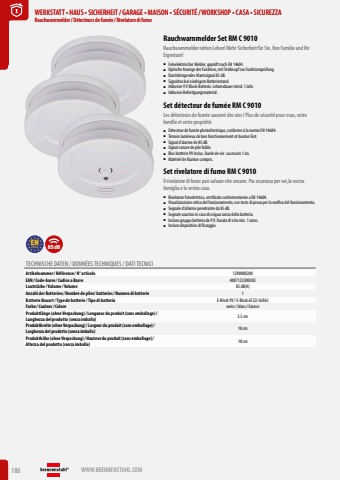 186 WWW.BRENNENSTUHL.COMWERKSTATT %u2022 HAUS %u2022 SICHERHEIT/ GARAGE %u2022 MAISON %u2022 S%u00c9CURIT%u00c9/WORKSHOP %u2022 CASA %u2022 SICUREZZARauchwarnmelder/ D%u00e9tecteurs de fum%u00e9e/ Rivelatore di fumoWERKSTATT %u2022 HAUS %u2022 SICHERHEIT/ GARAGE %u2022 MAISON %u2022 S%u00c9CURIT%u00c9/WORKSHOP %u2022 CASA %u2022 SICUREZZARauchwarnmelder/ D%u00e9tecteurs de fum%u00e9e/ Rivelatore di fumoRauchwarnmelder Set RM C 9010Rauchwarnmelder retten Leben! Mehr Sicherheit f%u00fcr Sie, Ihre Familie und Ihr Eigentum!%u25a0 Fotoelektrischer Melder, gepr%u00fcft nach EN 14604.%u25a0 Optische Anzeige der Funktion, mit Testknopf zur Funktionspr%u00fcfung.%u25a0 Durchdringendes Alarmsignal 85 dB.%u25a0 Signalton bei niedrigem Batteriestand.%u25a0 Inklusive 9 V Block-Batterie. Lebensdauer mind. 1 Jahr.%u25a0 Inklusive Befestigungsmaterial.Set d%u00e9tecteur de fum%u00e9e RM C 9010Les d%u00e9tecteurs de fum%u00e9e sauvent des vies ! Plus de s%u00e9curit%u00e9 pour vous, votre famille et votre propri%u00e9t%u00e9.%u25a0 D%u00e9tecteur de fum%u00e9e photo%u00e9lectrique, conforme %u00e0 la norme EN 14604.%u25a0 T%u00e9moin lumineux de bon fonctionnement et bouton Test.%u25a0 Signal d%u2019alarme de 85 dB.%u25a0 Signal sonore de pile faible.%u25a0 Bloc batterie 9V inclus. Dur%u00e9e de vie%u00a0: au moins 1 an.%u25a0 Mat%u00e9riel de fixation compris.Set rivelatore di fumo RM C 9010Il rivelatore di fumo pu%u00f2 salvare vite umane. Piu sicurezza per voi,la vostra famiglia e la vostra casa.%u25a0 Rivelatore fotoelettrico, certificato conformemente a EN 14604.%u25a0 Visualizzazione ottica del funzionamento, con tasto di prova per la verifica del funzionamento.%u25a0 Segnale d%u2019allarme penetrante da 85 dB.%u25a0 Segnale acustico in caso di esigua carica della batteria.%u25a0 Incluso gruppo batteria da 9 V. Durata di vita min. 1 anno.%u25a0 Incluso dispositivo di fissaggio.EN14604 85dBTECHNISCHE DATEN / DONN%u00c9ES TECHNIQUES / DATI TECNICIArtikelnummer/ R%u00e9f%u00e9rence / N%u00b0 articolo 1290080200EAN/ Code-barre / Codice a Barre 4007123300303Lautst%u00e4rke / Volume / Volume 85 dB(A)Anzahl der Batterien / Nombre de piles/ batteries/ Numero di batterie 1Batterie Bauart/ Type de batterie / Tipo di batteria E-Block 9V / E-Block 6F22/ 6LR61Farbe / Couleur/ Colore weiss/ blanc/ biancoProduktl%u00e4nge (ohne Verpackung)/ Longueur du produit (sans emballage)/ Lunghezza del prodotto (senza imballo) 3.5 cmProduktbreite (ohne Verpackung)/ Largeur du produit (sans emballage)/ Larghezza del prodotto (senza imballo) 10 cmProdukth%u00f6he (ohne Verpackung)/ Hauteur du produit (sans emballage)/ Altezza del prodotto (senza imballo) 10 cm