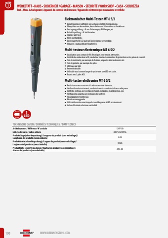 190 WWW.BRENNENSTUHL.COMWERKSTATT %u2022 HAUS %u2022 SICHERHEIT/ GARAGE %u2022 MAISON %u2022 S%u00c9CURIT%u00c9/WORKSHOP %u2022 CASA %u2022 SICUREZZAPr%u00fcf-, Mess- & Suchger%u00e4te/ Appareils de contr%u00f4le et de mesure/ Apparecchi elettronici per misurazione e verificheWERKSTATT %u2022 HAUS %u2022 SICHERHEIT/ GARAGE %u2022 MAISON %u2022 S%u00c9CURIT%u00c9/WORKSHOP %u2022 CASA %u2022 SICUREZZAPr%u00fcf-, Mess- & Suchger%u00e4te/ Appareils de contr%u00f4le et de mesure/ Apparecchi elettronici per misurazione e verificheElektronischer Multi-Tester MT 6 S/2%u25a0 Ber%u00fchrungsloses Auffinden von Leitungen mit Wechselspannung.%u25a0 %u00dcberpr%u00fcfen von Aussenleiter, Neutralleiter und Schutzleiter an Steckdosen.%u25a0 Durchgangspr%u00fcfung, z.B. von Sicherungen, Gl%u00fchlampen, etc.%u25a0 Polarit%u00e4tspr%u00fcfung, z.B. bei Batterien.%u25a0 Anzeige %u00fcber LED.%u25a0 Klein und handlich.%u25a0 Durch superhelle LED auch als Taschenlampe verwendbar.%u25a0 Inklusive 3 austauschbare Knopfzellen.Multi-testeur %u00e9lectronique MT 6 S/2%u25a0 Localisation sans contact de fils %u00e9lectriques avec tension alternative.%u25a0 Contr%u00f4le de conducteur actif, conducteur neutre et conducteur de protection sur les prises de courant.%u25a0 Test de continuit%u00e9, par exemple de fusibles, ampoules %u00e0 incandescence etc.%u25a0 Test de polarit%u00e9, par exemple des piles.%u25a0 Affichage par LED.%u25a0 Petit et maniable.%u25a0 Utilisable aussi comme lampe de poche avec une LED tr%u00e8s claire.%u25a0 Fourni avec 3 piles AG3.Multi-tester elettronico MT 6 S/2%u25a0 Per la ricerca senza contatto di cavi con tensione alternata.%u25a0 Verifica di conduttori esterni, conduttori neutri e conduttori di terra nelle prese.%u25a0 Controllo continuo, per esempio di fusibili, lampade a incandescenza, ecc.%u25a0 Verifica della polarit%u00e0, per esempio nelle batterie.%u25a0 Visualizzazione tramite LED.%u25a0 Piccolo e maneggevole.%u25a0 Utilizzabile anche come lampada tascabile grazie ai LED extraluminosi.%u25a0 Incluse 3 batterie a bottone sostituibili.BATTERYINCLUSIVE1LEDTECHNISCHE DATEN / DONN%u00c9ES TECHNIQUES / DATI TECNICIArtikelnummer/ R%u00e9f%u00e9rence / N%u00b0 articolo 1297150EAN/ Code-barre / Codice a Barre 4007123249916Produktl%u00e4nge (ohne Verpackung)/ Longueur du produit (sans emballage)/ Lunghezza del prodotto (senza imballo) 3 cmProduktbreite (ohne Verpackung)/ Largeur du produit (sans emballage)/ Larghezza del prodotto (senza imballo) 10 cmProdukth%u00f6he (ohne Verpackung)/ Hauteur du produit (sans emballage)/ Altezza del prodotto (senza imballo) 24.5 cm