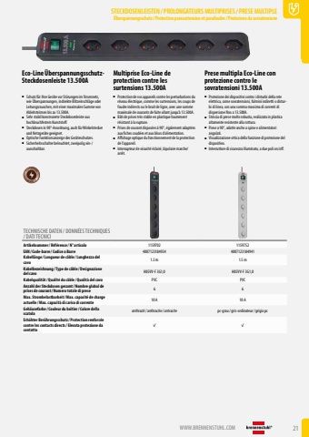 WWW.BRENNENSTUHL.COM 21STECKDOSENLEISTEN /PROLONGATEURS MULTIPRISES/PRESE MULTIPLE%u00dcberspannungsschutz/ Protection parasurtension et parafoudre/ Protezione da sovratensioneSTECKDOSENLEISTEN /PROLONGATEURS MULTIPRISES/PRESE MULTIPLE%u00dcberspannungsschutz/ Protection parasurtension et parafoudre/ Protezione da sovratensioneEco-Line %u00dcberspannungsschutzSteckdosenleiste 13.500AMultiprise Eco-Line de protection contre les surtensions 13.500APrese multipla Eco-Line con protezione contro le sovratensioni 13.500A %u25a0 Schutz f%u00fcr Ihre Ger%u00e4te vor St%u00f6rungen im Stromnetz, wie %u00dcberspannungen, indirekte Blitzeinschl%u00e4ge oder Leitungsrauschen, mit einer maximalen Summe von Ableitstr%u00f6men bis zu 13.500A.%u25a0 Sehr stabil konstruierte Steckdosenleiste aus hochbruchfestem Kunststoff.%u25a0 Steckdosen in 90%u00b0-Anordnung, auch f%u00fcr Winkelstecker und Netzger%u00e4te geeignet.%u25a0 Optische Funktionsanzeige des Ger%u00e4teschutzes.%u25a0 Sicherheitsschalter beleuchtet, zweipolig ein-/ausschaltbar.%u25a0 Protection de vos appareils contre les perturbations du r%u00e9seau %u00e9lectrique, comme les surtensions, les coups de foudre indirects ou le bruit de ligne, avec une somme maximale de courants de fuite allant jusqu%u2019%u00e0 13.500A.%u25a0 B%u00e2ti de prises tr%u00e8s stable en plastique hautement r%u00e9sistant %u00e0 la rupture.%u25a0 Prises de courant dispos%u00e9es %u00e0 90%u00b0, %u00e9galement adapt%u00e9es aux fiches coud%u00e9es et aux blocs d%u2019alimentation.%u25a0 Affichage optique du fonctionnement de la protection de l%u2019appareil.%u25a0 Interrupteur de s%u00e9curit%u00e9 %u00e9clair%u00e9, bipolaire marche/arr%u00eat.%u25a0 Protezione dei dispositivi contro i disturbi della rete elettrica, come sovratensioni, fulmini indiretti o disturbi di linea, con una somma massima di correnti di dispersione fino a 13.500A.%u25a0 Striscia di prese molto robusta, realizzata in plastica altamente resistente alla rottura.%u25a0 Prese a 90%u00b0, adatte anche a spine e alimentatori angolati.%u25a0 Visualizzazione ottica della funzione di protezione del dispositivo.%u25a0 Interruttore di sicurezza illuminato, a due poli on/off.13.500 APROTECTIONTECHNISCHE DATEN / DONN%u00c9ES TECHNIQUES / DATI TECNICIArtikelnummer/ R%u00e9f%u00e9rence / N%u00b0 articolo 1159702 1159752EAN/ Code-barre / Codice a Barre 4007123184934 4007123184941Kabell%u00e4nge / Longueur de c%u00e2ble / Lunghezza del cavo1.5 m 1.5 mKabelbezeichnung / Type de c%u00e2ble / Designazione del cavo H05VV-F 3G1,0 H05VV-F 3G1,0Kabelqualit%u00e4t/ Qualit%u00e9 du c%u00e2ble / Qualit%u00e0 del cavo PVC PVCAnzahl der Steckdosen gesamt/ Nombre global de prises de courant/ Numero totale di prese 6 6Max. Strombelastbarkeit/ Max. capacit%u00e9 de charge actuelle / Max. capacit%u00e0 di carico di corrente 10 A 10 AGeh%u00e4usefarbe / Couleur du bo%u00eetier/ Colore della scatola anthrazit/ anthracite/ antracite pc-grau/ gris-ordinateur/ grigio pcErh%u00f6hter Ber%u00fchrungsschutz/ Protection renforc%u00e9e contre les contacts directs/ Elevata protezione da contatto%uf001 %uf001
