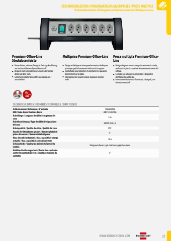 WWW.BRENNENSTUHL.COM 23STECKDOSENLEISTEN /PROLONGATEURS MULTIPRISES/PRESE MULTIPLETischsteckdosenleisten / Prolongateurs multiprises encastrable/ Multipresa a torreSTECKDOSENLEISTEN /PROLONGATEURS MULTIPRISES/PRESE MULTIPLETischsteckdosenleisten / Prolongateurs multiprises encastrable/ Multipresa a torrePremium-Office-Line SteckdosenleisteMultiprise Premium-Office-Line Presa multipla Premium-OfficeLine %u25a0 Formsch%u00f6nes, zeitloses Design in Desktop-Ausf%u00fchrung aus hochbruchfestem Spezial-Kunststoff.%u25a0 Bequem zum Einstecken und Schalten der Ger%u00e4te direkt auf dem Tisch.%u25a0 Sicherheitsschalter beleuchtet, zweipolig ein-/ausschaltbar.%u25a0 Design esth%u00e9tique et intemporel en version desktop en plastique sp%u00e9cial hautement r%u00e9sistant %u00e0 la rupture.%u25a0 Confortable pour brancher et commuter les appareils directement sur la table.%u25a0 Interrupteur de s%u00e9curit%u00e9 %u00e9clair%u00e9, bipolaire marche/arr%u00eat.%u25a0 Design elegante e senza tempo in versione da tavolo, realizzato in plastica speciale altamente resistente alla rottura.%u25a0 Comodo per collegare e commutare i dispositivi direttamente sul tavolo.%u25a0 Interruttore di sicurezza illuminato, a due poli, con interruttore on/off.3mTECHNISCHE DATEN / DONN%u00c9ES TECHNIQUES / DATI TECNICIArtikelnummer/ R%u00e9f%u00e9rence / N%u00b0 articolo 1156252416EAN/ Code-barre / Codice a Barre 4007123282906Kabell%u00e4nge / Longueur de c%u00e2ble / Lunghezza del cavo3 mKabelbezeichnung / Type de c%u00e2ble / Designazione del cavo H05VV-F 3G1,5Kabelqualit%u00e4t/ Qualit%u00e9 du c%u00e2ble / Qualit%u00e0 del cavo PVCAnzahl der Steckdosen gesamt/ Nombre global de prises de courant/ Numero totale di prese 6Max. Strombelastbarkeit/ Max. capacit%u00e9 de charge actuelle / Max. capacit%u00e0 di carico di corrente 10 AGeh%u00e4usefarbe / Couleur du bo%u00eetier/ Colore della scatola lichtgrau/schwarz/ gris clair/noir/ grigio luce/neroErh%u00f6hter Ber%u00fchrungsschutz/ Protection renforc%u00e9e contre les contacts directs/ Elevata protezione da contatto%uf001