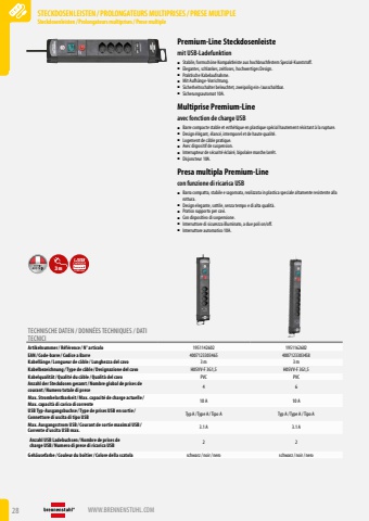 28 WWW.BRENNENSTUHL.COMSTECKDOSENLEISTEN /PROLONGATEURS MULTIPRISES/PRESE MULTIPLESteckdosenleisten / Prolongateurs multiprises/ Prese multipleSTECKDOSENLEISTEN /PROLONGATEURS MULTIPRISES/PRESE MULTIPLESteckdosenleisten / Prolongateurs multiprises/ Prese multiplePremium-Line Steckdosenleistemit USB-Ladefunktion%u25a0 Stabile, formsch%u00f6ne Kompaktleiste aus hochbruchfestem Spezial-Kunststoff.%u25a0 Elegantes, schlankes, zeitloses, hochwertiges Design.%u25a0 Praktische Kabelaufnahme.%u25a0 Mit Aufh%u00e4nge-Vorrichtung.%u25a0 Sicherheitsschalter beleuchtet, zweipolig ein-/ausschaltbar.%u25a0 Sicherungsautomat 10A.Multiprise Premium-Lineavec fonction de charge USB%u25a0 Barre compacte stable et esth%u00e9tique en plastique sp%u00e9cial hautement r%u00e9sistant %u00e0 la rupture.%u25a0 Design %u00e9l%u00e9gant, %u00e9lanc%u00e9, intemporel et de haute qualit%u00e9.%u25a0 Logement de c%u00e2ble pratique.%u25a0 Avec dispositif de suspension.%u25a0 Interrupteur de s%u00e9curit%u00e9 %u00e9clair%u00e9, bipolaire marche/arr%u00eat.%u25a0 Disjoncteur 10A.Presa multipla Premium-Linecon funzione di ricarica USB%u25a0 Barra compatta, stabile e sagomata, realizzata in plastica speciale altamente resistente alla rottura.%u25a0 Design elegante, sottile, senza tempo e di alta qualit%u00e0.%u25a0 Pratico supporto per cavi.%u25a0 Con dispositivo di sospensione.%u25a0 Interruttore di sicurezza illuminato, a due poli on/off.%u25a0 Interruttore automatico 10A.3m 3.100 mATECHNISCHE DATEN / DONN%u00c9ES TECHNIQUES / DATI TECNICIArtikelnummer/ R%u00e9f%u00e9rence / N%u00b0 articolo 1951142602 1951162602EAN/ Code-barre / Codice a Barre 4007123303465 4007123303458Kabell%u00e4nge / Longueur de c%u00e2ble / Lunghezza del cavo 3 m 3 mKabelbezeichnung / Type de c%u00e2ble / Designazione del cavo H05VV-F 3G1,5 H05VV-F 3G1,5Kabelqualit%u00e4t/ Qualit%u00e9 du c%u00e2ble / Qualit%u00e0 del cavo PVC PVCAnzahl der Steckdosen gesamt/ Nombre global de prises de courant/ Numero totale di prese 4 6Max. Strombelastbarkeit/ Max. capacit%u00e9 de charge actuelle / Max. capacit%u00e0 di carico di corrente 10 A 10 AUSB Typ-Ausgangsbuchse / Type de prises USB en sortie / Connettore di uscita di tipo USB Typ A / Type A / Tipo A Typ A / Type A / Tipo AMax. Ausgangsstrom USB / Courant de sortie maximal USB / Corrente d%u2019uscita USB max. 3.1 A 3.1 AAnzahl USB Ladebuchsen / Nombre de prises de charge USB / Numero di prese di ricarica USB 2 2Geh%u00e4usefarbe / Couleur du bo%u00eetier/ Colore della scatola schwarz/ noir/ nero schwarz/ noir/ nero