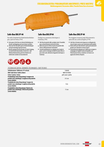 WWW.BRENNENSTUHL.COM 43STECKDOSENLEISTEN /PROLONGATEURS MULTIPRISES/PRESE MULTIPLEKabelmanagement/ Accessoires c%u00e2bles/ Fascette Ferma Cavo ed accessoriSTECKDOSENLEISTEN /PROLONGATEURS MULTIPRISES/PRESE MULTIPLEKabelmanagement/ Accessoires c%u00e2bles/ Fascette Ferma Cavo ed accessoriSTECKDOSENLEISTEN /PROLONGATEURS MULTIPRISES/PRESE MULTIPLEKabelmanagement/ Accessoires c%u00e2bles/ Fascette Ferma Cavo ed accessoriSafe-Box BIG IP 44 Safe-Box BIG IP44 Safe-Box BIG IP 44F%u00fcr mehr Sicherheit bei Kabelsteckverbindungen, auch im Freien, IP 44.Prot%u00e8ge vos connexions %u00e9lectriques %u00e0 l%u2019ext%u00e9rieur, IP44.Per maggiore sicurezza negli allacciamenti a spina dei cavi, anche all%u2019aperto, IP 44.%u25a0 Extra grosse Safe-Box zur sicheren Verbindung von Stecker und Kupplung und zum Schutz vor N%u00e4sse.%u25a0 Ideal auch f%u00fcr besonders grosse Steckverbindungen und grossvolumige Exportversionen.%u25a0 Bestens geeignet f%u00fcr den Einsatz z.B. beim Camping, im Garten beim Rasenm%u00e4hen, f%u00fcr die Fest- oder Weihnachtsbeleuchtung oder bei Arbeiten mit elektrischen Ger%u00e4ten im Aussenbereich.%u25a0 Safe-Box de grande taille, prot%u00e9g%u00e9 contre l%u00b4humidit%u00e9, pour un branchement s%u00e9curis%u00e9 des fiches.%u25a0 Id%u00e9al aussi pour les fiches et prises de grande taille. Evite un d%u00e9branchement involontaire.%u25a0 Convient parfaitement au camping, pour tondre le gazon, pour les %u00e9clairages de No%u00ebl ou autres f%u00eates et pour toute autre utilisation d%u2019appareils %u00e9lectriques %u00e0 l%u2019ext%u00e9rieur.%u25a0 Safe-Box in formato extra large per un collegamento sicuro di spina e presa e per la protezione dall%u2019umidit%u00e0.%u25a0 Ideale anche per allacciamenti a spina particolarmente grandi e per voluminose versioni export.%u25a0 Particolarmente adeguato per l%u2019utilizzo per esempio in campeggio,nel tagliare il prato del giardino, per l%u2019illuminazione festiva e natalizia e nel lavoro con apparecchi elettrici all%u2019aperto.IP44 3G 1,5MAX.TECHNISCHE DATEN / DONN%u00c9ES TECHNIQUES / DATI TECNICIArtikelnummer/ R%u00e9f%u00e9rence / N%u00b0 articolo 1160440EAN/ Code-barre / Codice a Barre 4007123170784Farbe / Couleur/ Colore gelb/ jaune/ gialloaProduktl%u00e4nge (ohne Verpackung)/ Longueur du produit (sans emballage)/ Lunghezza del prodotto (senza imballo)21.5 cmProduktbreite (ohne Verpackung)/ Largeur du produit (sans emballage)/ Larghezza del prodotto (senza imballo)9 cmProdukth%u00f6he (ohne Verpackung)/ Hauteur du produit (sans emballage)/ Altezza del prodotto (senza imballo)7.5 cm