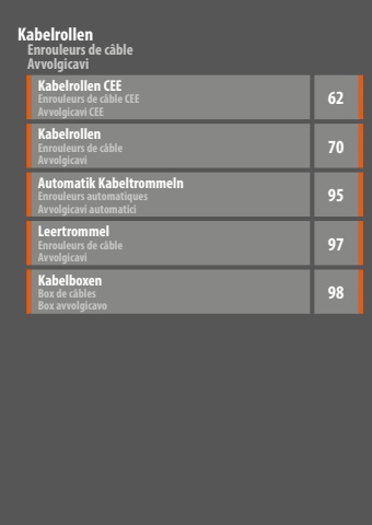 Enrouleurs de c%u00e2bleKabelrollenAvvolgicaviKabelrollen CEEEnrouleurs de c%u00e2ble CEE Avvolgicavi CEE62KabelrollenEnrouleurs de c%u00e2ble Avvolgicavi70Automatik KabeltrommelnEnrouleurs automatiques Avvolgicavi automatici95LeertrommelEnrouleurs de c%u00e2ble Avvolgicavi97KabelboxenBox de c%u00e2bles Box avvolgicavo98