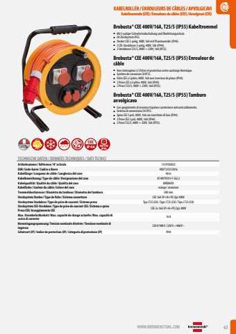 WWW.BRENNENSTUHL.COM 63KABELROLLEN /ENROULEURS DE C%u00c2BLES/ AVVOLGICAVIKabeltrommeln (CEE)/ Enrouleurs de c%u00e2bles (CEE)/ Avvolgicavi (CEE)KABELROLLEN /ENROULEURS DE C%u00c2BLES/ AVVOLGICAVIKabeltrommeln (CEE)/ Enrouleurs de c%u00e2bles (CEE)/ Avvolgicavi (CEE)KABELROLLEN /ENROULEURS DE C%u00c2BLES/ AVVOLGICAVIKabeltrommeln (CEE)/ Enrouleurs de c%u00e2bles (CEE)/ Avvolgicavi (CEE)Brobusta%u00ae CEE 400V/16A, T25/5 (IP55) Kabeltrommel%u25a0 Mit 3-poliger Sicherheitsabschaltung und %u00dcberhitzungsschutz.%u25a0 CH Stecksystem IP55.%u25a0 Stecker CEE 5-polig, 400V, 16A mit Phasenwender (IP44).%u25a0 2 CEE-Steckdosen 5-polig, 400V, 16A (IP44).%u25a0 2 Steckdosen T25/5, 400V + 230V, 16A (IP55).Brobusta%u00ae CEE 400V/16A, T25/5 (IP55) Enrouleur de c%u00e2ble%u25a0 Avec interrupteur %u00e0 3 fiches et protection contre surcharge thermique.%u25a0 Syst%u00e8me de connexion CH IP55.%u25a0 Fiche CEE a 5 p%u00f4les, 400V, 16A avec inverseur de phase (IP44).%u25a0 2 Prises CEE a 5 p%u00f4les, 400V, 16A (IP44).%u25a0 2 Prises T25/5, 400V + 230V, 16A (IP55).Brobusta%u00ae CEE 400V/16A, T25/5 (IP55) Tamburo avvolgicavo%u25a0 Con spegnimento di sicurezza tripolare e protezione antisurriscaldamento.%u25a0 Sistema di connessione CH IP55.%u25a0 Spina CEE 5 poli, 400V, 16A con invertitore di fase (IP44).%u25a0 2 Prese CEE 5 poli, 400V, 16A (IP44).%u25a0 2 Prese T25/5, 400V + 230V, 16A (IP55).ROBUSTSPECIALIP44CEECH/T25IP55TECHNISCHE DATEN / DONN%u00c9ES TECHNIQUES / DATI TECNICIArtikelnummer/ R%u00e9f%u00e9rence / N%u00b0 articolo 1319102832EAN/ Code-barre / Codice a Barre 4007123312016Kabell%u00e4nge / Longueur de c%u00e2ble / Lunghezza del cavo 40 mKabelbezeichnung / Type de c%u00e2ble / Designazione del cavo AT-N07V3V3-F 5G2,5Kabelqualit%u00e4t/ Qualit%u00e9 du c%u00e2ble / Qualit%u00e0 del cavo BREMAXXKabelfarbe / Couleur du c%u00e2ble / Colore del cavo orange/ arancioneTrommeldurchmesser/ Diam%u00e8tre du tambour/ Diametro del tamburo 380 mmStecksystem Stecker/ Type de fiche / Sistema connettore CEE 16A 3P+N+PE (5p) 400VStecksystem Steckdose / Type de prise de courant/ Sistema presa Typ J T25 (CH)/ Type J T25 (CH)/ Tipo J T25 (CH)Stecksystem CEE-Steckdose / Type de prise de courant CEE/ Sistema a spina Presa CEE/ Accoppiamento CEE CEE 2x 16A 3P+N+PE (5p) 400VMax. Strombelastbarkeit/ Max. capacit%u00e9 de charge actuelle / Max. capacit%u00e0 di carico di corrente 16 ANenneingangsspannung / Tension nominale d%u2019entr%u00e9e / Tensione nominale di ingresso 230 V/400 V / 230 V~/400 V~Schutzart (IP)/ Indice de protection (IP)/ Categoria di protezione (IP) IP44