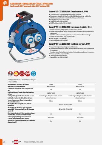 68 WWW.BRENNENSTUHL.COMKABELROLLEN /ENROULEURS DE C%u00c2BLES/ AVVOLGICAVIKabeltrommeln (CEE)/ Enrouleurs de c%u00e2bles (CEE)/ Avvolgicavi (CEE)KABELROLLEN /ENROULEURS DE C%u00c2BLES/ AVVOLGICAVIKabeltrommeln (CEE)/ Enrouleurs de c%u00e2bles (CEE)/ Avvolgicavi (CEE)KABELROLLEN /ENROULEURS DE C%u00c2BLES/ AVVOLGICAVIKabeltrommeln (CEE)/ Enrouleurs de c%u00e2bles (CEE)/ Avvolgicavi (CEE)Garant%u00ae ST CEE 230V/16A Kabeltrommel, IP44%u25a0 Trommelk%u00f6rper aus Spezialkunststoff auf verzinktem Tragegestell.%u25a0 Ergonomischer Handgriff mit Achse f%u00fcr perfekte Kabelf%u00fchrung beim Auf- und Abrollen.%u25a0 %u00dcberhitzungsschutz, Kontroll-Leuchte bei %u00dcberhitzung und %u00dcberlastung.%u25a0 Stecksystem IP67, Trommelk%u00f6rper IP44.%u25a0 Stecker CEE 3-polig, 230V/16A (IP67).%u25a0 2 CEE-Steckdosen 3-polig, 230V/16A (IP67).Garant%u00ae ST CEE 230V/16A Enrouleur de c%u00e2ble, IP44%u25a0 Corps du tambour en plastique sp%u00e9cial sur ch%u00e2ssis porteur galvanis%u00e9.%u25a0 Poign%u00e9e ergonomique avec axe pour un guidage parfait du c%u00e2ble lors de l%u2019enroulement et du d%u00e9roulement.%u25a0 Protection contre la surchauffe, voyant lumineux en cas de surchauffe et de surcharge.%u25a0 Syst%u00e8me de connexion IP67, corps du tambour IP44.%u25a0 Fiche CEE 3 p%u00f4les, 230V/16A (IP67).%u25a0 2 prises CEE 3 p%u00f4les, 230V/16A (IP67).Garant%u00ae ST CEE 230V/16A Tamburo per cavi, IP44%u25a0 Corpo dell%u2019avvolgitore in plastica speciale su telaio zincato.%u25a0 Impugnatura ergonomica con asse per una guida perfetta del cavo durante l%u2019avvolgimento e lo svolgimento.%u25a0 Protezione contro il surriscaldamento, indicatore luminoso di surriscaldamento e sovraccarico.%u25a0 Sistema a spina IP67, corpo bobina IP44.%u25a0 Spina CEE a 3 poli, 230V/16A (IP67).%u25a0 2 prese CEE a 3 poli, 230V/16A (IP67).ROBUSTSPECIALIP44 CEE 230 VCEE 230 VTECHNISCHE DATEN / DONN%u00c9ES TECHNIQUES / DATI TECNICIArtikelnummer/ R%u00e9f%u00e9rence / N%u00b0 articolo 1132826 1132825EAN/ Code-barre / Codice a Barre 4007123119240 4007123181759Kabell%u00e4nge / Longueur de c%u00e2ble / Lunghezza del cavo25 m 33 mKabelbezeichnung / Type de c%u00e2ble / Designazione del cavo H07RN-F 3G2,5 H07RN-F 3G2,5Kabelqualit%u00e4t/ Qualit%u00e9 du c%u00e2ble / Qualit%u00e0 del cavo Gummi-Neopren / N%u00e9opr%u00e8ne/ Gomma-Neoprene Gummi-Neopren / N%u00e9opr%u00e8ne/ Gomma-NeopreneKabelfarbe / Couleur du c%u00e2ble / Colore del cavo schwarz/ noir/ nero schwarz/ noir/ neroTrommeldurchmesser/ Diam%u00e8tre du tambour/ Diametro del tamburo 290 mm 320 mmStecksystem Stecker/ Type de fiche / Sistema connettore CEE 16A 2P+PE (3p) 230VStecksystem CEE-Steckdose / Type de prise de courant CEE/ Sistema a spina Presa CEE/ Accoppiamento CEECEE 2x 16A 2P+PE (3p) 230VMax. Strombelastbarkeit/ Max. capacit%u00e9 de charge actuelle / Max. capacit%u00e0 di carico di corrente 16 A 16 ANenneingangsspannung / Tension nominale d%u2019entr%u00e9e / Tensione nominale di ingresso 230 V / 230 V~ 230 V / 230 V~Schutzart (IP)/ Indice de protection (IP)/ Categoria di protezione (IP) IP44 IP44