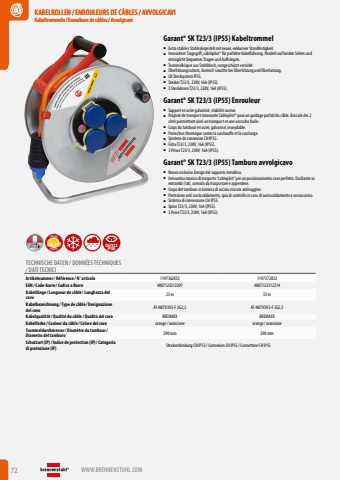 72 WWW.BRENNENSTUHL.COMKABELROLLEN /ENROULEURS DE C%u00c2BLES/ AVVOLGICAVIKabeltrommeln / Enrouleurs de c%u00e2bles/ AvvolgicaviKABELROLLEN /ENROULEURS DE C%u00c2BLES/ AVVOLGICAVIKabeltrommeln / Enrouleurs de c%u00e2bles/ AvvolgicaviKABELROLLEN /ENROULEURS DE C%u00c2BLES/ AVVOLGICAVIKabeltrommeln / Enrouleurs de c%u00e2bles/ AvvolgicaviGarant%u00ae SK T23/3 (IP55) Kabeltrommel%u25a0 Extra stabiles Stahlrohrgestell mit neuer, exklusiver Standfestigkeit.%u25a0 Innovativer Tragegriff %u201ecablepilot%u201c f%u00fcr perfekte Kabelf%u00fchrung. Pendelt auf beiden Seiten und erm%u00f6glicht bequemes Tragen und Aufh%u00e4ngen.%u25a0 Trommelk%u00f6rper aus Stahlblech, rostgesch%u00fctzt verzinkt.%u25a0 %u00dcberhitzungsschutz, Kontroll-Leuchte bei %u00dcberhitzung und %u00dcberlastung.%u25a0 CH Stecksystem IP55.%u25a0 Stecker T23/3, 230V, 16A (IP55).%u25a0 3 Steckdosen T23/3, 230V, 16A (IP55).Garant%u00ae SK T23/3 (IP55) Enrouleur%u25a0 Support en acier galvanis%u00e9, stabilit%u00e9 accrue.%u25a0 Poign%u00e9e de transport innovante Cablepilot%u00ae pour un guidage parfait du c%u00e2ble. Bascule des 2 c%u00f4t%u00e9s permettant ainsi un transport et une accroche facile.%u25a0 Corps du tambour en acier, galvanis%u00e9, inoxydable.%u25a0 Protection thermique contre la surchauffe et la surcharge.%u25a0 Syst%u00e8me de connexion CH IP55.%u25a0 Fiche T23/3, 230V, 16A (IP55).%u25a0 3 Prises T23/3, 230V, 16A (IP55).Garant%u00ae SK T23/3 (IP55) Tamburo avvolgicavo%u25a0 Nuovo esclusivo Design del supporto metallico.%u25a0 Innovativo manico di trasporto %u201ccablepilot%u201d per un posizionamento cavo perfetto. Oscillante su entrambi i lati, comodo da trasportare e appendere.%u25a0 Corpo del tamburo in lamiera di acciaio zincata antiruggine.%u25a0 Protezione anti surriscaldamento, spia di controllo in caso di surriscaldamento e sovraccarico.%u25a0 Sistema di connessione CH IP55.%u25a0 Spina T23/3, 230V, 16A (IP55).%u25a0 3 Prese T23/3, 230V, 16A (IP55).ROBUSTSPECIALCH/T23IP55TECHNISCHE DATEN / DONN%u00c9ES TECHNIQUES / DATI TECNICIArtikelnummer/ R%u00e9f%u00e9rence / N%u00b0 articolo 1197362832 1197372832EAN/ Code-barre / Codice a Barre 4007123312207 4007123312214Kabell%u00e4nge / Longueur de c%u00e2ble / Lunghezza del cavo25 m 33 mKabelbezeichnung / Type de c%u00e2ble / Designazione del cavo AT-N07V3V3-F 3G2,5 AT-N07V3V3-F 3G2,5Kabelqualit%u00e4t/ Qualit%u00e9 du c%u00e2ble / Qualit%u00e0 del cavo BREMAXX BREMAXXKabelfarbe / Couleur du c%u00e2ble / Colore del cavo orange/ arancione orange/ arancioneTrommeldurchmesser/ Diam%u00e8tre du tambour/ Diametro del tamburo 290 mm 290 mmSchutzart (IP)/ Indice de protection (IP)/ Categoria di protezione (IP) Steckverbindung CH IP55/ Connexion CH IP55/ Connettore CH IP55
