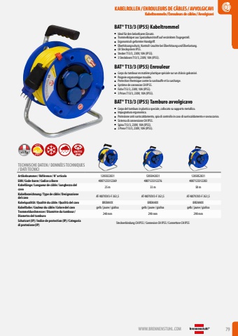 WWW.BRENNENSTUHL.COM 79KABELROLLEN /ENROULEURS DE C%u00c2BLES/ AVVOLGICAVIKabeltrommeln / Enrouleurs de c%u00e2bles/ AvvolgicaviKABELROLLEN /ENROULEURS DE C%u00c2BLES/ AVVOLGICAVIKabeltrommeln / Enrouleurs de c%u00e2bles/ AvvolgicaviKABELROLLEN /ENROULEURS DE C%u00c2BLES/ AVVOLGICAVIKabeltrommeln / Enrouleurs de c%u00e2bles/ AvvolgicaviBAT%u00ae T13/3 (IP55) Kabeltrommel%u25a0 Ideal f%u00fcr den belastbaren Einsatz.%u25a0 Trommelk%u00f6rper aus Spezialkunststoff auf verzinktem Tragegestell.%u25a0 Ergonomisch geformter Handgriff.%u25a0 %u00dcberhitzungsschutz, Kontroll-Leuchte bei %u00dcberhitzung und %u00dcberlastung.%u25a0 CH Stecksystem IP55.%u25a0 Stecker T13/3, 230V, 10A (IP55).%u25a0 3 Steckdosen T13/3, 230V, 10A (IP55).BAT%u00ae T13/3 (IP55) Enrouleur%u25a0 Corps du tambour en mati%u00e8re plastique sp%u00e9ciale sur un ch%u00e2ssis galvanis%u00e9.%u25a0 Poign%u00e9e ergonomique moul%u00e9e.%u25a0 Protection thermique contre la surchauffe et la surcharge.%u25a0 Syst%u00e8me de connexion CH IP55.%u25a0 Fiche T13/3, 230V, 10A (IP55).%u25a0 3 Prises T13/3, 230V, 10A (IP55).BAT%u00ae T13/3 (IP55) Tamburo avvolgicavo%u25a0 Corpo del tamburo in plastica speciale, collocato su supporto metallico.%u25a0 Impugnatura ergonomica.%u25a0 Protezione anti surriscaldamento, spia di controllo in caso di surriscaldamento e sovraccarico.%u25a0 Sistema di connessione CH IP55.%u25a0 Spina T13/3, 230V, 10A (IP55).%u25a0 3 Prese T13/3, 230V, 10A (IP55).ROBUSTSPECIALCH/T13IP55TECHNISCHE DATEN / DONN%u00c9ES TECHNIQUES / DATI TECNICIArtikelnummer/ R%u00e9f%u00e9rence / N%u00b0 articolo 1205022831 1205042831 1205052831EAN/ Code-barre / Codice a Barre 4007123312269 4007123312276 4007123312283Kabell%u00e4nge / Longueur de c%u00e2ble / Lunghezza del cavo25 m 33 m 50 mKabelbezeichnung / Type de c%u00e2ble / Designazione del cavo AT-N07V3V3-F 3G1,5 AT-N07V3V3-F 3G1,5 AT-N07V3V3-F 3G1,5Kabelqualit%u00e4t/ Qualit%u00e9 du c%u00e2ble / Qualit%u00e0 del cavo BREMAXX BREMAXX BREMAXXKabelfarbe / Couleur du c%u00e2ble / Colore del cavo gelb/ jaune/ gialloa gelb/ jaune/ gialloa gelb/ jaune/ gialloaTrommeldurchmesser/ Diam%u00e8tre du tambour/ Diametro del tamburo 240 mm 290 mm 290 mmSchutzart (IP)/ Indice de protection (IP)/ Categoria di protezione (IP) Steckverbindung CH IP55/ Connexion CH IP55/ Connettore CH IP55