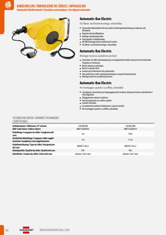 96 WWW.BRENNENSTUHL.COMKABELROLLEN /ENROULEURS DE C%u00c2BLES/ AVVOLGICAVIAutomatik-Kabeltrommeln / Enrouleurs automatiques/ Avvolgicavi automaticiKABELROLLEN /ENROULEURS DE C%u00c2BLES/ AVVOLGICAVIAutomatik-Kabeltrommeln / Enrouleurs automatiques/ Avvolgicavi automaticiAutomatic-Box ElectricF%u00fcr Wand- und Deckenmontage, schwenkbar.%u25a0 Automatik-Kabelaufroller f%u00fcr die moderne Arbeitsplatzeinrichtung in Industrie und Handwerk.%u25a0 Robustes Kunststoffgeh%u00e4use.%u25a0 Kr%u00e4ftiger Spiralfederantrieb.%u25a0 St%u00f6rungsfreie Schleifkontakte.%u25a0 Mit %u00dcberhitzungsschutz und Kontroll-Leuchte.%u25a0 F%u00fcr Wand- und Deckenmontage, schwenkbar.Automatic-Box ElectricMontage mural ou au plafond, pivotant.%u25a0 L%u2019enrouleur de c%u00e2ble automatique pour un %u00e9quipement moderne des postes de travail dans l%u2019industrie et l%u2019artisanat.%u25a0 Bo%u00eetier robuste en plastique.%u25a0 Ressort %u00e0 spirale muni.%u25a0 Contacts par frottements tr%u00e8s performants.%u25a0 Avec protection contre surcharge thermique et voyant d%u2019avertissement.%u25a0 Montage mural ou au plafond, pivotant.Automatic-Box ElectricPer montaggio a parete e a soffitto, orientabile.%u25a0 L%u2019avvolgicavo automatico per l%u2019equipaggiamento moderno del posto di lavoro nell%u2019industria e nell%u2019artigianato.%u25a0 Alloggiamento robusto in plastica.%u25a0 Potente propulsore con molla a spirale.%u25a0 Contatti striscianti.%u25a0 Con protezione antisurriscaldamento e spia di controllo.%u25a0 Per montaggio a parete e a soffitto, orientabile.TECHNISCHE DATEN / DONN%u00c9ES TECHNIQUES / DATI TECNICIArtikelnummer/ R%u00e9f%u00e9rence / N%u00b0 articolo 1241052300 1241032300EAN/ Code-barre / Codice a Barre 4007123284245 4007123284214Kabell%u00e4nge / Longueur de c%u00e2ble / Lunghezza del cavo5 m 10 mZus%u00e4tzliche Kabell%u00e4nge / Longueur c%u00e2ble suppl%u00e9mentaire / Lunghezza cavo supplementare 1 m 1.5 mKabelbezeichnung / Type de c%u00e2ble / Designazione del cavo H05VV-F 3G1,5 H05VV-F 3G1,5Kabelqualit%u00e4t/ Qualit%u00e9 du c%u00e2ble / Qualit%u00e0 del cavo PVC PVCKabelfarbe / Couleur du c%u00e2ble / Colore del cavo schwarz/ noir/ nero schwarz/ noir/ nero