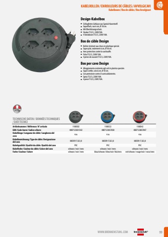 WWW.BRENNENSTUHL.COM 99KABELROLLEN /ENROULEURS DE C%u00c2BLES/ AVVOLGICAVIKabelboxen / Box de c%u00e2bles/ Box AvvolgicaviKABELROLLEN /ENROULEURS DE C%u00c2BLES/ AVVOLGICAVIKabelboxen / Box de c%u00e2bles/ Box AvvolgicaviDesign-Kabelbox%u25a0 Schlagfestes Geh%u00e4use aus Spezial-Kunststoff.%u25a0 Superflach, nur 6 cm, %u00d8 18 cm.%u25a0 Mit %u00dcberhitzungsschutz.%u25a0 Stecker T12/3, 230V/10A.%u25a0 4 Steckdosen T13/3, 230V/10A.Box de c%u00e2ble Design%u25a0 Bo%u00eetier r%u00e9sistant aux chocs en plastique sp%u00e9cial.%u25a0 Super plat, seulement 6 cm, %u00d8 18 cm.%u25a0 Avec protection contre la surchauffe.%u25a0 Fiche T12/3, 230V/10A.%u25a0 4 prises de courant T13/3, 230V/10A.Box per cavo Design%u25a0 Alloggiamento resistente agli urti in plastica speciale.%u25a0 Super sottile, solo 6 cm, %u00d8 18 cm.%u25a0 Con protezione contro il surriscaldamento.%u25a0 Spina T12/3, 230V/10A.%u25a0 4 prese T13/3, 230V/10A.TECHNISCHE DATEN / DONN%u00c9ES TECHNIQUES / DATI TECNICIArtikelnummer/ R%u00e9f%u00e9rence / N%u00b0 articolo 1100502 1100532 1100542EAN/ Code-barre / Codice a Barre 4007123031542 4007123057030 4007123057047Kabell%u00e4nge / Longueur de c%u00e2ble / Lunghezza del cavo4 m 4 m 4 mKabelbezeichnung / Type de c%u00e2ble / Designazione del cavo H05VV-F 3G1,0 H05VV-F 3G1,0 H05VV-F 3G1,0Kabelqualit%u00e4t/ Qualit%u00e9 du c%u00e2ble / Qualit%u00e0 del cavo PVC PVC PVCKabelfarbe / Couleur du c%u00e2ble / Colore del cavo schwarz/ noir/ nero schwarz/ noir/ nero schwarz/ noir/ neroFarbe / Couleur/ Colore schwarz/ noir/ nero blau/schwarz/ bleu/noir/ blu/nero rot/schwarz / rouge/noir / rosso/nero