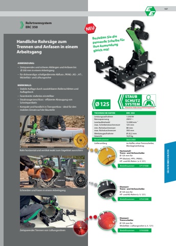 %u00d8125Zeitsparendes Trennen von L%u00fcftungsrohrenRohrtrennsystemERC 350 Handliche Rohrs%u00e4ge zumTrennen und Anfasen in einem ArbeitsgangANWENDUNG:%u2013 Zeitsparendes und sicheres Abl%u00e4ngen und Anfasen bis %u00d8 350 mm in einem Arbeitsgang%u2013 f%u00fcr dickwandige; schallged%u00e4mmte Abfl uss-, PKNG-, KG- , HT-, Wickelfalz- und L%u00fcftungsrohreMERKMALE:%u2013 Stabile Auflage durch ausziehbaren Rollenschlitten und Auflagebock%u2013 Fasenbreite stufenlos einstellbar%u2013 Staubsaugeranschluss - effiziente Absaugung von Schnittpartikeln%u2013 Kompakt und handlich in Transportbox - ideal f%u00fcr den mobilen Einsatz auf der BaustelleS%u00c4GEN/TRENNEN/SCHLITZENSTAUBSCHUTZSYSTEMMineralische St%u00e4ube k%u00f6nnen krebserzeugend sein!TECHNISCHE DATEN ERC 350Leistungsaufnahme 1.250 WNennspannung 230 V ~Leerlaufdrehzahl 12.000 min-1max. Scheibendurchmesser 125 mmmin. Rohrdurchmesser 80 mmmax. Rohrdurchmesser 350 mmWerkzeugaufnahme %u00d8 22,2 mmGewicht 14,9 kgBestellnummer 06652000Lieferumfang im Koffer, ohne Trennscheibe, Montagewerkzeug%u2013 Hartmetall- Trenn- und Anfasscheibe %u00d8 125 mm f%u00fcr PP (Skolan),-PPS-, PKNG-, HT- und KG-Rohre (s. S 121)%u2013 Diamant- Trenn- und Anfasscheibe %u00d8 125 mm f%u00fcr HT- und KG-Rohre (s. S. 121)%u2013 Diamant- Trennscheibe %u00d8 125 mm f%u00fcr Wickelfalz-, L%u00fcftungsrohre (s. S. 121)Bestellen Sie die passende Scheibe f%u00fcrIhre Anwendunggleich mit!Rohr horizontal und vertikal exakt zum S%u00e4geblatt ausrichtenSchneiden und Fasen in einem ArbeitsgangBestellnummer 37137000Bestellnummer 37541000Bestellnummer 37450000107