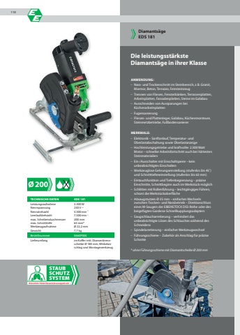 %u00d8200Die leistungsst%u00e4rksteDiamants%u00e4ge in ihrer Klasse ANWENDUNG:%u2013 Nass- und Trockenschnitt im Steinbereich, z.B. Granit, Marmor, Beton, Terrazzo, Feinsteinzeug%u2013 Trennen von Fliesen, Fensterb%u00e4nken, Terrassenplatten, Arbeitsplatten, Fassadenplatten, Steine im Galabau%u2013 Ausschneiden von Aussparungen bei K%u00fcchenarbeitsplatten%u2013 Fugensanierung%u2013 Fliesen- und Plattenleger, Galabau, K%u00fcchenmonteure, Steinmetzbetriebe, Fu%u00dfbodensaniererMERKMALE:%u2013 Elektronik %u2013 Sanftanlauf, Temperatur- und %u00dcberlastabschaltung sowie %u00dcberlastanzeige%u2013 Hochleistungsgetriebe und kraftvoller 2.300 Watt Motor %u2013 schneller Arbeitsfortschritt auch bei h%u00e4rtesten Steinmaterialien%u2013 Ein-/Ausschalter mit Einschaltsperre %u2013 kein unbeabsichtigtes Einschalten%u2013 Werkzeuglose Gehrungseinstellung (stufenlos bis 45%u02da) und Schnitttiefeneinstellung (stufenlos bis 63 mm)%u2013 Eintauchfunktion und Tiefenbegrenzung %u2013 pr%u00e4zise Einschnitte, Schnittbeginn auch im Werkst%u00fcck m%u00f6glich%u2013 Schlitten mit Rollenf%u00fchrung %u2013 leichtg%u00e4ngiges F%u00fchren, schont die Werkst%u00fcckoberfl%u00e4che%u2013 Absaugstutzen %u00d8 35 mm %u2013 einfaches Wechseln zwischen Trocken- und Nassbetrieb %u2013 Direktanschluss eines M-Saugers der EIBENSTOCK DSS-Reihe oder des beigef%u00fcgten Gardena-Schnellkupplungsadapters%u2013 Saugschlaucharretierung %u2013 verhindert das unbeabsichtigte L%u00f6sen des Schlauches w%u00e4hrend des Schneidens%u2013 Spindelarretierung %u2013 einfacher Werkzeugwechsel%u2013 F%u00fchrungsschiene %u2013 Zubeh%u00f6r als Anschlag f%u00fcr pr%u00e4zise Schnitte* ohne F%u00fchrungsschiene mit Diamantscheibe %u00d8 200 mmDiamants%u00e4geEDS 181DUSTPROTECTIONSYSTEMMineral dust may cause cancer!STAUBSCHUTZSYSTEMMineralische St%u00e4ube k%u00f6nnen krebserzeugend sein!TECHNISCHE DATEN EDS 181Leistungsaufnahme 2.300 WNennspannung 230 V ~Nenndrehzahl 4.300 min-1Leerlaufdrehzahl 7.500 min-1max. Scheibendurchmesser 200 mmmax. Schnitttiefe 63 mm*Werkzeugaufnahme %u00d8 22,2 mmGewicht 7,7 kgBestellnummer 0660P000Lieferumfang im Koffer inkl. Diamanttrennscheibe %u00d8 180 mm, Winkelanschlag und Montagewerkzeug110