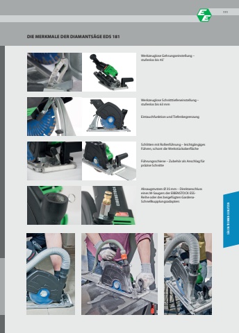 DIE MERKMALE DER DIAMANTS%u00c4GE EDS 181Werkzeuglose Gehrungseinstellung %u2013 stufenlos bis 45%u02daWerkzeuglose Schnitttiefeneinstellung %u2013 stufenlos bis 63 mmEintauchfunktion und TiefenbegrenzungSchlitten mit Rollenf%u00fchrung %u2013 leichtg%u00e4ngiges F%u00fchren, schont die Werkst%u00fcckoberfl%u00e4cheF%u00fchrungsschiene %u2013 Zubeh%u00f6r als Anschlag f%u00fcr pr%u00e4zise SchnitteAbsaugstutzen %u00d8 35 mm %u2013 Direktanschluss eines M-Saugers der EIBENSTOCK ESSReihe oder des beigef%u00fcgten GardenaSchnellkupplungsadapters S%u00c4GEN/TRENNEN/SCHLITZEN111