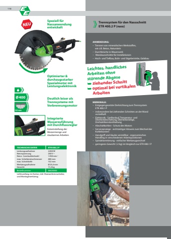 152 mm%u00d8400Trennsystem f%u00fcr den NassschnittETR 400.2 P (nass)Optimierter & durchzugsstarker Spezialmotor mit LeistungselektronikDeutlich leiser als Trennsysteme mit VerbrennungsmotorIntegrierte Wasserzuf%u00fchrung mit DurchflussreglerFeineinstellung der Wassermenge undstaubarmes ArbeitenSpeziell f%u00fcr NassanwendungentwickeltLeichtes, handliches Arbeiten ohnest%u00f6rende Abgase%uf0e5 ziehender Schnitt%uf0e5 optimal bei vertikalen ArbeitenTECHNISCHE DATEN ETR 400.2 PLeistungsaufnahme 2.850 WNennspannung 230 V ~Nenn- /Leerlaufdrehzahl 1.950 min-1max. Scheibendurchmesser 400 mmmax. Schnitttiefe 152 mmWerkzeugaufnahme %u00d8 25,4 mmGewicht 11,4 kgBestellnummer 0682E000Lieferumfang: im Karton, inkl. Diamanttrennscheibe, und MontagewerkzeugANWENDUNG:%u2013 Trennen von mineralischen Werkstoffen, wie z.B. Beton, Naturstein%u2013 Durchbr%u00fcche in Mauerwerk%u2013 Wandausschnitte f%u00fcr Installationen%u2013 Hoch- und Tiefbau, Bohr- und S%u00e4gebetriebe, GalabauMERKMALE:%u2013 Entgegengesetzte Drehrichtung zum Trennsystem ETR 400.1 P %u2013 insbesondere bei ziehenden Schnitten an der Wand vorteilhaft%u2013 Elektronik - Sanftanlauf, Temperatur- und %u00dcberlastabschaltung, %u00dcberlastanzeige, Drehzahlkonstanthaltung%u2013 Abschaltkohlen - Schutz des Motors%u2013 Serviceanzeige - rechtzeitiger Hinweis zum Wechsel der Kohleb%u00fcrsten%u2013 Handgriff und Haube verstellbar - ergonomisches Handling in verschiedenen Arbeitspositionen%u2013 Spindelarretierung - einfacher Werkzeugwechsel%u2013 geringeres Gewicht (-2 kg) im Vergleich zur ETR 400.1 P116