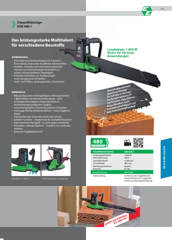 Langlebiger 1.800 W Motor f%u00fcr h%u00e4rteste Anwendungen480AnwendungenDas leistungsstarke Multitalent f%u00fcr verschiedene Baustoffe ANWENDUNG:%u2013 Schneiden von Hochlochziegel (z.B. Poroton%u00ae), Poren-beton, Holz sowie druckfesten D%u00e4mmstoffen%u2013 Flexibles, schnelles und somit kostensparendes Trennen von Hochlochziegel im Vergleich zu schwer transportierbaren Ziegels%u00e4gen%u2013 Einfaches Herstellen von Ausklinkungen sowie passgenaues Schneiden%u2013 Hoch- und Tiefbau, Ausbaugewerke, ZimmereienMERKMALE:%u2013 Robuste Bauweise mit langlebigem, leistungsstarkem 1.800 W Motor f%u00fcr h%u00e4rteste Anwendung %u2013 hohe Schnittgeschwindigkeit, Diagonalschnitte in Hochlochziegel problemlos m%u00f6glich%u2013 Verwindungssteifes Schwert f%u00fcr pr%u00e4zises Schneiden%u2013 Zwei gegenl%u00e4ufig arbeitende Bl%u00e4tter %u2013 r%u00fcckschlagfreies S%u00e4gen%u2013 Durchziehen des Schwertes durch den Schnitt%u2013 Gebl%u00e4se-Funktion %u2013 Staubschutz f%u00fcr Getriebe/Anwender%u2013 Ergonomischer Handgriff %u2013 an zwei Seiten montierbar%u2013 Kompakte, schlanke Bauform %u2013 handlich, f%u00fcr randnahes Arbeiten%u2013 Einfacher S%u00e4geblattwechselDoppelblatts%u00e4geEDB 480.1Gebl%u00e4se-Funktion Griff beidseitig montierbargro%u00dfe Schnittl%u00e4nge bis 480 mmTECHNISCHE DATEN EDB 480.1Leistungsaufnahme 1.800 WNennspannung 230 V ~Leerlaufhubzahl 3.100 min-1Schnittl%u00e4nge 480 mmWerkzeugaufnahme SpezialGewicht 6,1 kgBestellnummer 06644000Lieferumfang im Karton inkl. S%u00e4geblattsatz Universal Premium, S%u00e4geblattschutz und MontagewerkzeugSpeziell abgestimmtesMaschinenkonzeptf%u00fcr Schnitte in Poroton%u00aebis Festigkeitsklasse 20mit Premium-S%u00e4gebl%u00e4ttern %u2013lange Standzeit, hohe Schnittgeschwindigkeit undgute FreischnitteigenschaftS%u00c4GEN/TRENNEN/SCHLITZEN117