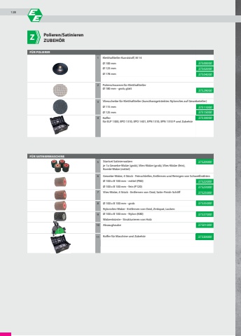1373000003730200037304000237329000337311000373150004 373300005 37520000637522000375230007 375250008 375350009 3753700010 3750100011 37330000Z Polieren/SatinierenZUBEH%u00d6RKletthaftteller Kunststoff, M 14%u00d8 100 mm%u00d8 123 mm%u00d8 178 mmPolierschwamm f%u00fcr Kletthaftteller%u00d8 180 mm - grob, glattVliesscheibe f%u00fcr Kletthaftteller (kunstharzgetr%u00e4nktes Nylonvlies auf Gewebeteller)%u00d8 115 mm%u00d8 125 mmKofferf%u00fcr ELP 1300, EPO 1310, EPO 1401, EPN 1310, EPN 1310 P und Zubeh%u00f6rStartset Satinierwalzenje 1x Gewebe-Walze (grob), Vlies-Walze (grob), Vlies-Walze (fein), Kombi-Walze (mittel)Gewebe-Walze, 4 St%u00fcck - Feinschleifen, Entfernen und Reinigen von Schwei%u00dfn%u00e4hten%u00d8 100 x B 100 mm - mittel (P80)%u00d8 100 x B 100 mm - fein (P120)Vlies-Walze, 4 St%u00fcck - Entfernen von Oxid, Satin-Finish-Schliff%u00d8 100 x B 100 mm - grobNylonvlies-Walze - Entfernen von Oxid, Zinkspat, Lacken%u00d8 100 x B 100 mm - Nylon (K80)Walzenb%u00fcrste - Strukturieren von HolzAbsaughaubeKoffer f%u00fcr Maschine und Zubeh%u00f6rF%u00dcR POLIERERF%u00dcR SATINIERMASCHINE128