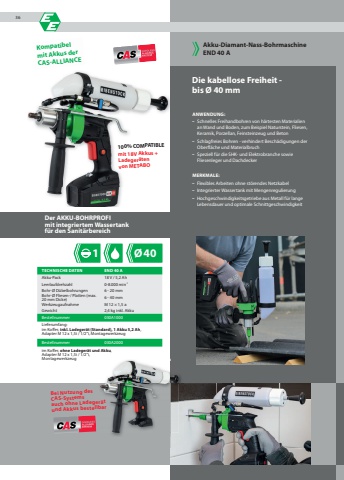 1 %u00d840100% COMPATIBLEmit 18V Akkus +Ladeger%u00e4tenvon METABODie kabellose Freiheit - bis %u00d8 40 mmANWENDUNG:%u2013 Schnelles Freihandbohren von h%u00e4rtesten Materialien an Wand und Boden, zum Beispiel Naturstein, Fliesen, Keramik, Porzellan, Feinsteinzeug und Beton%u2013 Schlagfreies Bohren - verhindert Besch%u00e4digungen der Oberfl%u00e4che und Materialbruch%u2013 Speziell f%u00fcr die SHK- und Elektrobranche sowie Fliesenleger und DachdeckerMERKMALE:%u2013 Flexibles Arbeiten ohne st%u00f6rendes Netzkabel%u2013 Integrierter Wassertank mit Mengenregulierung%u2013 Hochgeschwindigkeitsgetriebe aus Metall f%u00fcr lange Lebensdauer und optimale SchnittgeschwindigkeitAkku-Diamant-Nass-BohrmaschineEND 40 ADer AKKU-BOHRPROFImit integriertem Wassertankf%u00fcr den Sanit%u00e4rbereichBei Nutzung des CAS-Systemsauch ohne Ladeger%u00e4t und Akkus bestellbarTECHNISCHE DATEN END 40 AAkku-Pack 18 V / 5,2 AhLeerlaufdrehzahl 0-8.000 min-1Bohr-%u00d8 D%u00fcbelbohrungen 6 - 20 mmBohr-%u00d8 Fliesen-/ Platten (max. 20 mm Dicke) 6 - 40 mmWerkzeugaufnahme M 12 %u00d7 1,5 aGewicht 2,4 kg inkl. AkkuBestellnummer 030A1000Lieferumfang:im Koffer, inkl. Ladeger%u00e4t (Standard), 1 Akku 5,2 Ah, Adapter M 12 x 1,5i / 1/2%u201ci, MontagewerkzeugBestellnummer 030A2000im Koffer, ohne Ladeger%u00e4t und Akku, Adapter M 12 x 1,5i / 1/2%u201ci, MontagewerkzeugKompatibelmit Akkus der CAS-ALLIANCE36
