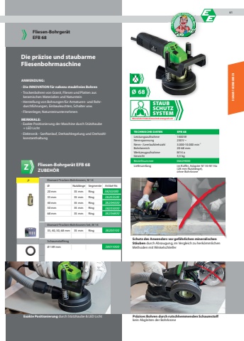 %u00d8 68P1 382020002 382035003 382040004 382050005 3820680063820010038011000%u00d8 68Fliesen-Bohrger%u00e4tEFB 68Die pr%u00e4zise und staubarmeFliesenbohrmaschineANWENDUNG:- Die INNOVATION f%u00fcr nahezu staubfreies Bohren- Trockenbohren von Granit, Fliesen und Platten aus  keramischen Materialien und Naturstein- Herstellung von Bohrungen f%u00fcr Armaturen- und Rohr-  durchf%u00fchrungen, Einbauleuchten, Schalter usw.- Fliesenleger, NatursteinunternehmenMERKMALE:- Exakte Positionierung der Maschine durch St%u00fctzhaube + LED Licht- Elektronik - Sanftanlauf, Drehzahlregelung und Drehzahl- konstanthaltungTECHNISCHE DATEN EFB 68Leistungsaufnahme 1400 WNennspannung 230 V ~Nenn- /Leerlaufdrehzahl 3.000-10.000 min-1Bohrbereich 20-68 mmWerkzeugaufnahme M14 aGewicht 3,5 kg Bestellnummer 0662H000Lieferumfang im Koffer, Adapter M 14i-M 14a(28 mm Nutzl%u00e4nge), ohne BohrkroneFliesen-Bohrger%u00e4t EFB 68ZUBEH%u00d6RPr%u00e4zises Bohren durch rutschhemmenden Schaumstoff kein Abgleiten der BohrkroneSchutz des Anwenders vor gef%u00e4hrlichen mineralischen St%u00e4uben durch Absaugung, im Vergleich zu herk%u00f6mmlichenMethoden mit WinkelschleiferZExakte Positionierung durch St%u00fctzhaube & LED LichtSTAUBSCHUTZSYSTEMMineralische St%u00e4ube k%u00f6nnen krebserzeugend sein!Diamant-Trocken-Bohrkronen, M 14%u00d8 Nutzl%u00e4nge Segmente Artikel-Nr.1 20 mm 35 mm Ring2 35 mm 35 mm Ring3 40 mm 35 mm Ring4 50 mm 35 mm Ring5 68 mm 35 mm RingDiamant-Trocken-Bohrkronen Set, M 1435, 40, 50, 68 mm 35 mm RingSchaumstoffringSchaumstoffring%u00d8 149 mmDIAMANT-KERNBOHREN61