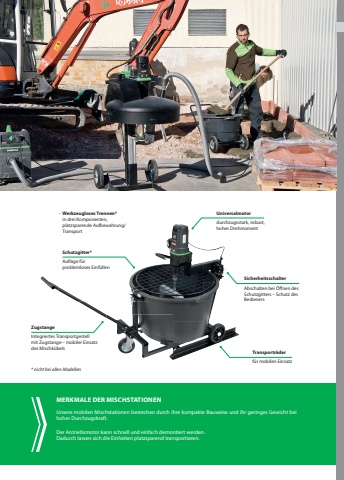 Unsere mobilen Mischstationen bestechen durch ihre kompakte Bauweise und ihr geringes Gewicht bei hoher Durchzugskraft. Der Antriebsmotor kann schnell und einfach demontiert werden. Dadurch lassen sich die Einheiten platzsparend transportieren.MERKMALE DER MISCHSTATIONENSchutzgitter*Auflage f%u00fcrproblemloses Einf%u00fcllenTransportr%u00e4derf%u00fcr mobilen Einsatz%u2022 Werkzeugloses Trennen* in drei Komponenten, platzsparende Aufbewahrung/TransportSicherheitsschalterAbschalten bei %u00d6ffnen des Schutzgitters %u2013 Schutz des BedienersUniversalmotordurchzugsstark, robust,hohes DrehmomentZugstangeIntegriertes Transportgestellmit Zugstange %u2013 mobiler Einsatz des Mischk%u00fcbels* nicht bei allen Modellen