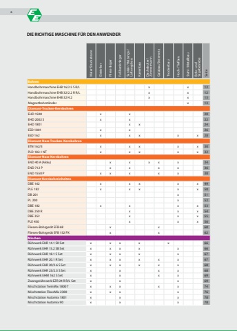 DIE RICHTIGE MASCHINE F%u00dcR DEN ANWENDER Maler/Stuckateure Elektriker Fliesenleger Fu%u00dfbodenleger Sanit%u00e4r-/Heizungs-/ L%u00fcftungsbau Kaminbau Dachdecker/ Zimmermann Galabau/Steinmetz Trockenbau Hoch-/Tiefbau Stahl-/Metallbau Bohr- und S%u00e4gebetriebe SeiteBohrenHandbohrmaschine EHB 16/2.5 S R/L x x 12Handbohrmaschine EHB 32/2.2 R R/L x x 12Handbohrmaschine EHB 32/4.2 x x 13Magnetbohrst%u00e4nder x 13Diamant-Trocken-KernbohrenEHD 1500 x x 20EHD 2002 S x x 22EHD 1801 x x 24ESD 1801 x x 26ESD 162 x x x x x 28Diamant-Nass-Trocken-KernbohrenETN 162/3 x x x x x 30PLD 182.1 NT x x x x x 32Diamant-Nass-KernbohrenEND 40 A (Akku) x x x x x 34END 712 P x x x x 36END 1550 P x x x x x 38Diamant-KernbohreinheitenDBE 162 x x x x x 49PLE 182 x x x x x 50DB 201 x 51PL 200 x 52DBE 182 x x x x 53DBE 250 R x x x 54DBE 352 x x x 55PLE 450 x x x 56Fliesen-Bohrger%u00e4t EFB 68 x x 60Fliesen-Bohrger%u00e4t EFB 152 PX x x 62MischenR%u00fchrwerk EHR 14.1 SK Set x x x x x 66R%u00fchrwerk EHR 15.2 SB Set x x x x x 66R%u00fchrwerk EHR 18.1 S Set x x x x x 67R%u00fchrwerk EHR 20.1 R Set x x x x x x 67R%u00fchrwerk EHR 20/2.6 S Set x x x x x x 68R%u00fchrwerk EHR 23/2.5 S Set x x x x 68R%u00fchrwerk EHM 162 S Set x x x x 69Zwangsr%u00fchrwerk EZR 24 R R/L Set x x x 69Mischstation TwinMix 1800 T x x x x x 74Mischstation FloorMix 2300 x x x x 76Mischstation Automix 1801 x x x 78Mischstation Automix 90 x x x 786