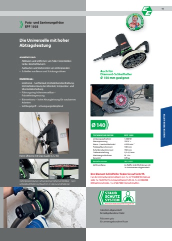 %u00d8140STAUBSCHUTZSYSTEMMineralische St%u00e4ube k%u00f6nnen krebserzeugend sein!TECHNISCHE DATEN EPF 1503Leistungsaufnahme 1.500 WNennspannung 230 V ~Nenn- /Leerlaufdrehzahl 4.000 min-1Fr%u00e4skopfdurchmesser 140 mmScheibendurchmesser 150 mmTiefeneinstellung 0,5-4,0 mmWerkzeugaufnahme M 14 aGewicht 3,9 kgBestellnummer 0651I000Lieferumfang im Koffer inkl. Drehkreuz mit16 Fr%u00e4ssternen abgewinkeltDie Universelle mit hoher AbtragsleistungANWENDUNG:%u2013 Abtragen und Entfernen von Putz, Fliesenkleber, Farbe, Beschichtungen%u2013 Aufrauhen und Vorbereiten von Untergr%u00fcnden%u2013 Schleifen von Beton und Schalungsn%u00e4htenMERKMALE:%u2013 Elektronik %u2013 Sanftanlauf, Drehzahlkonstanthaltung, Drehzahlabsenkung bei %u00dcberlast, Temperatur- und %u00dcberlastabschaltung%u2013 F%u00fchrungsring h%u00f6henverstellbar %u2013 Fr%u00e4stiefenbegrenzung%u2013 B%u00fcrstenkranz %u2013 hohe Absaugleistung f%u00fcr staubarmes Arbeiten %u2013 Softb%u00fcgelgriff %u2013 schwingungsd%u00e4mpfendPutz- und Sanierungsfr%u00e4seEPF 1503Tiefenbegrenzung: F%u00fchrungsring h%u00f6henverstellbar %u2013 kein unbeabsichtigtes Eintauchen in das GrundmaterialDen Diamant-Schleifteller finden Sie auf Seite 99.F%u00fcr die Umr%u00fcstung ben%u00f6tigen Sie: 1x 37416000 Werkzeugsatz, 1x 76301927 Einmaulschl%u00fcssel SW 32, 1x 37206000 Mitnahmescheibe, 1x 37207000 Flanschmutter.Fr%u00e4sstern abgewinkeltf%u00fcr kalkgebundene PutzeFr%u00e4sstern spitzf%u00fcr zementgebundene PutzeAuch f%u00fcrDiamant-Schleifteller %u00d8 150 mm geeignetHohe Effizienz mit Ergo Guide (s. S. 95)SCHLEIFEN/FR%u00c4SEN/GL%u00c4TTEN93