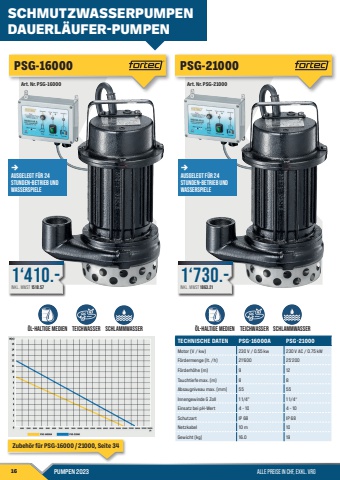 16 PUMPEN 2023 ALLE PREISE IN CHF, EXKL. VRGTECHNISCHE DATEN PSG-16000A PSG-21000Motor (V / kw) 230 V / 0.55 kw 230 V AC / 0.75 kWF%u00f6rdermenge (lt. /h) 21'600 25%u2018200 F%u00f6rderh%u00f6he (m) 9 12Tauchtiefe max. (m) 8 8Absaugniveau max. (mm) 55 55Innengewinde G Zoll 1 1/4\1 1/4%u201cEinsatz bei pH-Wert 4 - 10 4 - 10Schutzart IP 68 IP 68Netzkabel 10 m 10Gewicht (kg) 16.0 19 Art. Nr. PSG-21000PSG-21000%u00f6l-haltige Medien Teichwasser SchlammwasserArt. Nr. PSG-16000PSG-16000%u2192Ausgelegt f%u00fcr 24 Stunden-Betrieb und Wasserspiele%u00f6l-haltige Medien Teichwasser Schlammwasser%u2192Ausgelegt f%u00fcr 24 Stunden-Betrieb und WasserspieleSCHMUTZWASSERPUMPENDAUERL%u00c4UFER-PUMPEN1%u2018410.-INKL. MWST 1518.571%u2018730.-INKL. MWST 1863.21Zubeh%u00f6r f%u00fcr PSG-16000 / 21000, Seite 34