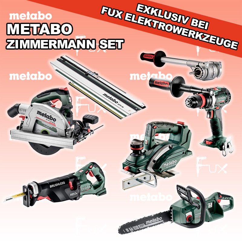 Das Ladenlokal bleibt vom 25. Dezember 2025 bis am 04. Januar 2026 geschlossen. Bestellungen und Lieferungen von Neugeräten werden trotz Ferienabwesenheit in gewohnter Fux-Manier entgegengenommen und ausgeliefert. Heute auf dieses Produkt 27% Rabatt! Zu "Zimmermann Set" von Metabo FULL Service: 36 Monate zum Nulltarif für Sie! Weitere Infos zum FULL Service Dieses Produkt ist CAS kompatibel! Weitere Infos zu CAS Sparfux Aktionen FUX SPECIAL EXKLUSIV BEI FUX Metabo Zimmermann SET 3 SOLO Bestell- und Artikelnummer: Zimmermann SET 3 SOLO BS 18 LTX BL Q I Akku-BohrschrauberAkkuspannung 18 V Drehzahl 0-550 / 0-2000 U/min Drehmoment hart / weich 130 / 65 Nm Gewicht (mit Akkupack) 2.3 kgInfos MS 36-18 LTX BL 40 Akku KettensägeAkkuspannung 18 V Schnittlänge 36 cm Max. Kettengeschwindigkeit 22 m/s Gewicht mit Akkupack 4,6 kgInfos SSEP 18 LTX BL MVT Akku-SäbelsägeAkkuspannung 18 V Hubzahl bei Leerlauf 0 - 3.000 /min Gewicht (mit Akkupack) 4.6 kgInfos HO 18 LTX 20-82 Akku-Einhand-HobelAkkuspannung 18 V Hobelbreite 82 mm Spanabnahme einstellbar 0-2 mm Gewicht 3.5 KgInfos KS 18 LTX 66 BL Akku HandkreissägeAkkuspannung 18 V Schnitt-Tiefe bei 90° 0-66 mm Sägeblatt 165 mm Gewicht 4.5 kgInfos Drehmomentvorsatz Power X3Drehmomentvorsatz ermöglicht dreifache Leistungssteigerung der Maschine (Drehmoment) für härteste AnwendungenInfos Kappschiene KFS 44Gesamtlänge 834 mm Schnittlänge 440 mmInfos Registriere die in diesem Set vorhandenen Metabo Maschinen auf metabo.ch, und ergattere dir bis zu 5 Gratis Akkus!Zusätzlich offerieren wir zu diesem Set einen Gratis Akku!OHNE AKKUS UND LADEGERÄT Standard-Ausrüstung In diesem Set enthalten: BS 18 LTX BL Q I Akku-Bohrschrauber MS 36-18 LTX BL 40 Akku Kettensäge SSEP 18 LTX BL MVT Akku-Säbelsäge HO 18 LTX 20-82 Akku-Einhand-Hobel KS 18 LTX 66 BL Akku Handkreissäge Drehmomentvorsatz Power X3 Kappschiene KFS 44 Listenpreis CHF 2'218.50 Fuxpreis CHF 1'604.00 inkl. 8.1% MwSt, inkl vRG Versand CHF 25.00 Kein Grauimport! Produkt bestellen 1 Stück 2 Stück 3 Stück 4 Stück 5 Stück 6 Stück 7 Stück 8 Stück 9 Stück 10 Stück Alle Angaben ohne Gewähr und solange Vorrat reicht!Wiederverkäufer werden? Produkt als PDF NEUHEITAKTION 27%