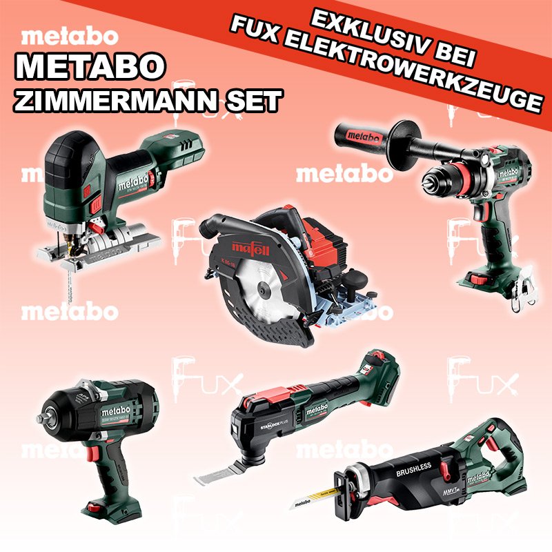Metabo Zimmermann SET 14 SOLO BS 18 LTX BL Q I Akku-Bohrschrauber SSW 18 LTX 1450 BL Akku-Schlagschrauber SSEP 18 LTX BL MVT Akku-Säbelsäge K 85 - 18 PURE Akku-Handkreissägen im L-MAX MT 18 LTX BL QSL Akku-Multitool STA 18 LTX 150 BL Akku-Stichsäge