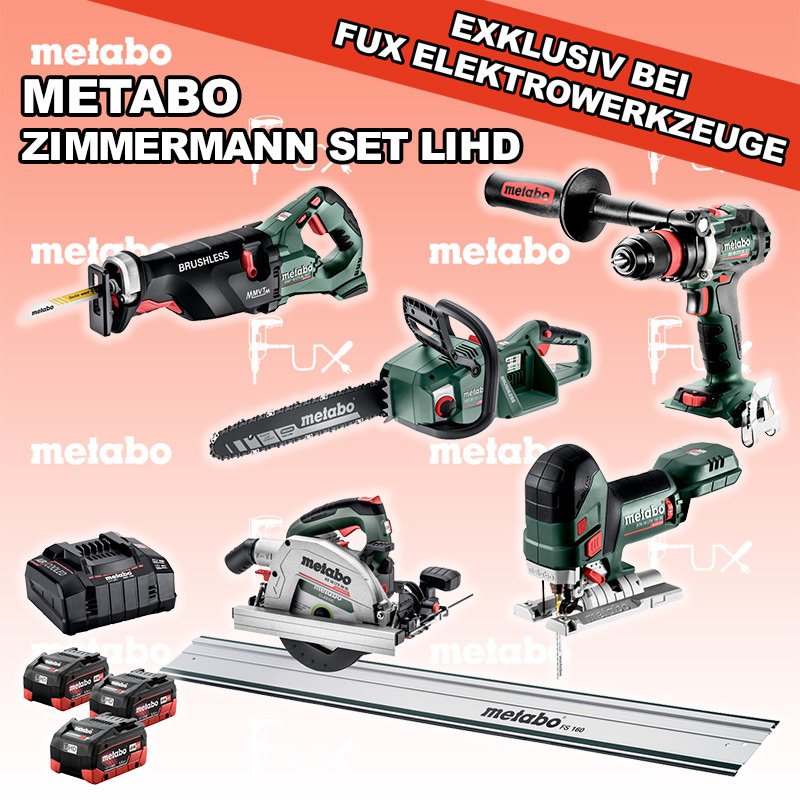 Metabo Zimmermann SET 16 LiHD BS 18 LTX BL Q I Akku-Bohrschrauber MS 36-18 LTX BL 40 Akku Kettensäge SSEP 18 LTX BL MVT Akku-Säbelsäge STA 18 LTX 150 BL Akku-Stichsäge KS 18 LTX 66 BL Akku Handkreissäge FS 160 Führungsschiene 18 V,  5.5 Ah, LiHD Akkupack ASC 145, 12 - 36 V "Air Cooled" Ladegerät