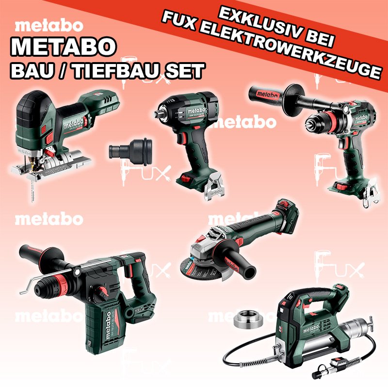 Das Ladenlokal bleibt vom 25. Dezember 2025 bis am 04. Januar 2026 geschlossen. Bestellungen und Lieferungen von Neugeräten werden trotz Ferienabwesenheit in gewohnter Fux-Manier entgegengenommen und ausgeliefert. Heute auf dieses Produkt 31% Rabatt! Zu "Bau / Tiefbau Set" von Metabo FULL Service: 36 Monate zum Nulltarif für Sie! Weitere Infos zum FULL Service Sparfux Aktionen FUX SPECIAL EXKLUSIV BEI FUX Metabo Bau / Tiefbau Set 2 SOLO Bestell- und Artikelnummer: Bau / Tiefbau Set 2 SOLO BS 18 LTX BL Q I Akku-BohrschrauberAkkuspannung 18 V Drehzahl 0-550 / 0-2000 U/min Drehmoment hart / weich 130 / 65 Nm Gewicht (mit Akkupack) 2.3 kgInfos STA 18 LTX 150 BL Akku-StichsägeAkkuspannung 18 V Hubzahl 1.000-3.500 /min Gewicht ohne Akkupack 1.9 kgInfos KH 18 LTX BL 24 Q Akku-KombihammerAkkuspannung 18 V Einzelschlagstärke 2.2 J Bohrleistung in Beton 24 mm Gewicht ohne Akkupack 3 kgInfos WVB 18 LT BL 11-125 Quick Akku-WinkelschleiferAkkuspannung 18 V Drehzahl 2.800 - 10.000 / min Ø 125 mm Scheiben Gewicht (mit Akkupack) 2.5 kgInfos SSW 18 LTX 550 BL Akku-SchlagschrauberAkkuspannung 18 V Anziehdrehmoment 550 Nm Werkzeugaufnahme 1/2" Gewicht ohne Akkupack 1,4 kgInfos FP 18 LTX Akku FettpresseAkkuspannung 18 V Maximaler Druck 690 bar Auspressgeschwindigkeit 100 / 290 ml/min Gewicht inkl. Akku 4.4 kgInfos Reduktions Adapter 1/2" auf 1/4" Aufnahme Max. 350 Nm Länge 45 mmInfos Adapter für Lube-Shuttle® 400GAdapter zum Umrüsten von Fettbehälter auf Lube-Shuttle®* Kartusche 400g geeignet für FP 18 LTXInfos Registriere die in diesem Set vorhandenen Metabo Maschinen auf metabo.ch, und ergattere dir bis zu 5 Gratis Akkus!Zusätzlich offerieren wir zu diesem Set einen Gratis Akku!OHNE AKKUS UND LADEGERÄT Standard-Ausrüstung In diesem Set enthalten: BS 18 LTX BL Q I Akku-Bohrschrauber STA 18 LTX 150 BL Akku-Stichsäge KH 18 LTX BL 24 Q Akku-Kombihammer WVB 18 LT BL 11-125 Quick Akku-Winkelschleifer SSW 18 LTX 550 BL Akku-Schlagschrauber FP 18 LTX Akku Fettpresse Reduktions Adapter Adapter für Lube-Shuttle® 400G Listenpreis CHF 2'218.00 Fuxpreis CHF 1'515.00 inkl. 8.1% MwSt, inkl vRG Frankolieferung Kein Grauimport! Produkt bestellen 1 Stück 2 Stück 3 Stück 4 Stück 5 Stück 6 Stück 7 Stück 8 Stück 9 Stück 10 Stück Alle Angaben ohne Gewähr und solange Vorrat reicht!Wiederverkäufer werden? Produkt als PDF NEUHEITAKTION 31%