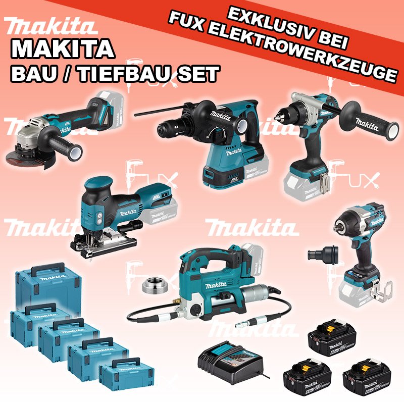 Das Ladenlokal bleibt vom 25. Dezember 2025 bis am 04. Januar 2026 geschlossen. Bestellungen und Lieferungen von Neugeräten werden trotz Ferienabwesenheit in gewohnter Fux-Manier entgegengenommen und ausgeliefert. Zu "Bau / Tiefbau Set" von Makita FUX SPECIAL EXKLUSIV BEI FUX Makita Bau / Tiefbau Set 4 Bestell- und Artikelnummer: maBau / Tiefbau Set 4 DDF492Z Akku-BohrschrauberAkkuspannung 18 V Leerlaufdrehzahl 0 - 550 / 0 - 2100 min⁻¹ Drehmoment hart / weich 130 / 65 Nm Gewicht inkl. Akku 2.3 - 2.6 kgInfos DJV18ZJ Akku-StichsägeAkkuspannung 18 V Hubzahl 800 - 3500/ min Schnittleistung Holz 135 mm / Stahl 10 mm Gewicht 2.5 kgInfos DHR243ZJ Akku-BohrhammerAkkuspannung 18 V Einzelschlagstärke 2.0 J ( EPTA ) Bohrleistung in Beton 24 mm Gewicht 3.4 kgInfos DGA506ZJ Akku-WinkelschleiferAkkuspannung 18 V Drehzahl 9000 U / min Scheibendurchmesser 125 mm Gewicht 2,5 kgInfos DTW700Z Akku-SchlagschrauberAkkuspannung 18 V Anziehdrehmoment 700 Nm Werkzeugaufnahme 1/2" Gewicht inkl. Akku 2.7 kgInfos DGP180Z Akku-FettpresseAkkuspannung 18 V Maximaler Druck 690 bar Auspressgeschwindigkeit 145 / 290 ml/min Gewicht inkl. Akku 6.1 kgInfos 3 x BL 1860 B ( Li-Ion Akku )18 V 6.0 Ah ( Li-Ion Akku ) Infos DC 18 RC Schnell-Ladegerätfür Akkus 14.4 - 18 Volt ( Li-Ion Akkus )Infos Reduktions Adapter 1/2" auf 1/4" Aufnahme Max. 350 Nm Länge 45 mmInfos Adapter für Lube-Shuttle® 400GAdapter zum Umrüsten von Fettbehälter auf Lube-Shuttle®* Kartusche 400g geeignet für FP 18 LTXInfos MAKPAC Gr. 2Produktabmessung (L x B x H) 395 x 295 x 163 mm Infos MAKPAC Gr. 3Produktabmessung (L x B x H) 377 x 277 x 176 mm Infos Einsatz für diverse Akkuschrauber Einsatz für DDF343ZJ, DDF441, DDF446, DDF448, DDF451, DDF453, DDF456R, DDF458, DDF459, DDF480, DDF481, DDF482, DDF484, DDF485, DDF486, DHP441, DHP446, DHP448, DHP451, DHP456, DHP458, DHP459, DHP470, DHP480, DHP481, DHP482, DHP484, DHP485, DHP486, DLX2126TJ1, DLX3092TJInfos Einsatz für DTW1001 / DTW1002 / DTW450Einsatz für DTW1001 / DTW1002 / DTW450 Makpac Koffer Typ C (821551-8) Infos Standard-Ausrüstung In diesem Set enthalten: DDF492Z Akku-Bohrschrauber DJV18ZJ Akku-Stichsäge DHR243ZJ Akku-Bohrhammer DGA506ZJ Akku-Winkelschleifer DTW700Z Akku-Schlagschrauber DGP180Z Akku-Fettpresse 3 x BL 1860 B ( Li-Ion Akku ) DC 18 RC Schnell-Ladegerät Reduktions Adapter Adapter für Lube-Shuttle® 400G MAKPAC Gr. 2 MAKPAC Gr. 3 Einsatz für diverse Akkuschrauber Einsatz für DTW1001 / DTW1002 / DTW450 Geliefert im KofferDGP180Z Akku-Fettpresse ohne Koffer Zubehör Listenpreis CHF 2'820.00 Fuxpreis CHF 1'918.00 inkl. 8.1% MwSt, inkl vRG Versand CHF 20.00 Kein Grauimport! Produkt bestellen 1 Stück 2 Stück 3 Stück 4 Stück 5 Stück 6 Stück 7 Stück 8 Stück 9 Stück 10 Stück Option: Makita BL 1860 B ( Li-lon Akku ) für CHF 95.- statt CHF 124.-Infos Alle Angaben ohne Gewähr und solange Vorrat reicht!Wiederverkäufer werden? Produkt als PDF NEUHEITAKTION 32%