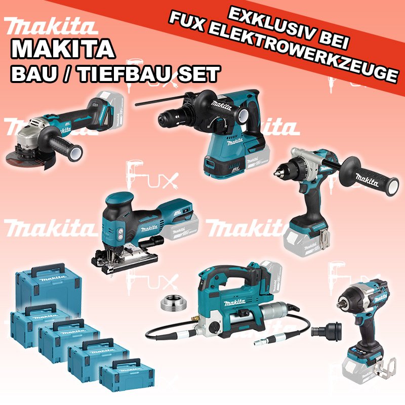 Makita Bau / Tiefbau Set 4 SOLO DDF492Z Akku-Bohrschrauber DJV18ZJ Akku-Stichsäge DHR243ZJ Akku-Bohrhammer DGA506ZJ Akku-Winkelschleifer DTW700Z Akku-Schlagschrauber DGP180Z Akku-Fettpresse Reduktions Adapter Adapter für Lube-Shuttle® 400G MAKPAC Gr. 2 MAKPAC Gr. 3 Einsatz für diverse Akkuschrauber Einsatz für DTW1001 / DTW1002 / DTW450