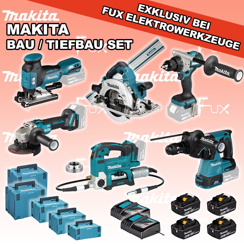 Das Ladenlokal bleibt vom 25. Dezember 2025 bis am 04. Januar 2026 geschlossen. Bestellungen und Lieferungen von Neugeräten werden trotz Ferienabwesenheit in gewohnter Fux-Manier entgegengenommen und ausgeliefert. Zu "Bau / Tiefbau Set" von Makita FUX SPECIAL EXKLUSIV BEI FUX Makita Bau / Tiefbau Set 6 Bestell- und Artikelnummer: maBau / Tiefbau Set 6 DDF492Z Akku-BohrschrauberAkkuspannung 18 V Leerlaufdrehzahl 0 - 550 / 0 - 2100 min⁻¹ Drehmoment hart / weich 130 / 65 Nm Gewicht inkl. Akku 2.3 - 2.6 kgInfos DJV18ZJ Akku-StichsägeAkkuspannung 18 V Hubzahl 800 - 3500/ min Schnittleistung Holz 135 mm / Stahl 10 mm Gewicht 2.5 kgInfos DHR243ZJ Akku-BohrhammerAkkuspannung 18 V Einzelschlagstärke 2.0 J ( EPTA ) Bohrleistung in Beton 24 mm Gewicht 3.4 kgInfos DGA506ZJ Akku-WinkelschleiferAkkuspannung 18 V Drehzahl 9000 U / min Scheibendurchmesser 125 mm Gewicht 2,5 kgInfos DGP180Z Akku-FettpresseAkkuspannung 18 V Maximaler Druck 690 bar Auspressgeschwindigkeit 145 / 290 ml/min Gewicht inkl. Akku 6.1 kgInfos DHS782ZJ Akku-HandkreissägeAkkuspannung 2 x 18 V Sägeblatt (Ø) 190 mm Schnitttiefe bei 90° 62.5 mm Gewicht 5.1 kg Infos 4 x BL 1860 B ( Li-Ion Akku )18 V 6.0 Ah ( Li-Ion Akku ) Infos 2 x DC 18 RC Schnell-Ladegerätfür Akkus 14.4 - 18 Volt ( Li-Ion Akkus )Infos Führungsschiene L = 140 cmgeeignet für SP6000 Handkreissäge mit passenden Adapter Auch für weitere Handkreissägen und Stichsägen geeignet mit passendem Adapter. ( 194579-2 )Infos Adapter für Lube-Shuttle® 400GAdapter zum Umrüsten von Fettbehälter auf Lube-Shuttle®* Kartusche 400g geeignet für FP 18 LTXInfos MAKPAC Gr. 2Produktabmessung (L x B x H) 395 x 295 x 163 mm Infos Einsatz für diverse Akkuschrauber Einsatz für DDF343ZJ, DDF441, DDF446, DDF448, DDF451, DDF453, DDF456R, DDF458, DDF459, DDF480, DDF481, DDF482, DDF484, DDF485, DDF486, DHP441, DHP446, DHP448, DHP451, DHP456, DHP458, DHP459, DHP470, DHP480, DHP481, DHP482, DHP484, DHP485, DHP486, DLX2126TJ1, DLX3092TJInfos Standard-Ausrüstung In diesem Set enthalten: DDF492Z Akku-Bohrschrauber DJV18ZJ Akku-Stichsäge DHR243ZJ Akku-Bohrhammer DGA506ZJ Akku-Winkelschleifer DGP180Z Akku-Fettpresse DHS782ZJ Akku-Handkreissäge 4 x BL 1860 B ( Li-Ion Akku ) 2 x DC 18 RC Schnell-Ladegerät Führungsschiene L = 140 cm Adapter für Lube-Shuttle® 400G MAKPAC Gr. 2 Einsatz für diverse Akkuschrauber Geliefert im KofferDGP180Z Akku-Fettpresse ohne Koffer Zubehör Listenpreis CHF 3'257.00 Fuxpreis CHF 2'215.00 inkl. 8.1% MwSt, inkl vRG Versand CHF 20.00 Kein Grauimport! Produkt bestellen 1 Stück 2 Stück 3 Stück 4 Stück 5 Stück 6 Stück 7 Stück 8 Stück 9 Stück 10 Stück Option: Makita BL 1860 B ( Li-lon Akku ) für CHF 95.- statt CHF 124.-Infos Alle Angaben ohne Gewähr und solange Vorrat reicht!Wiederverkäufer werden? Produkt als PDF NEUHEITAKTION 32%