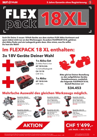 Die Ausstattung der Maschinen entspricht der %u00fcblichen Grundausstattung. Technische %u00c4nderungen, Preis%u00e4nderungen und Irrtum vorbehalten. Alle Preise verstehen sich als unverbindliche Preisempfehlung exkl. MwSt. + vRB. 11 Aktion g%u00fcltig bis 31.03.2026Nur solange der Vorrat reicht3 Jahre Garantie ohne RegistrierungSuch Dir Deine 3 neuen 18Volt Ger%u00e4te aus dem starken FLEX Akku-Sortiment und spare dabei nicht nur an den Werkzeugen: Zu jedem FLEXPACK18 XL geh%u00f6ren drei Akku-Packs und ein Ladeger%u00e4t gratis dazu. Also nimm, was Du willst. Du hast die Wahl!Im FLEXPACK 18 XL enthalten:3x 18V Ger%u00e4te Deiner Wahl1x Akku-Set2x Akku-Pack Li-IonAP 18/5.0 Ah1x Schnellladeger%u00e4tCA 12/18CHF 413.%u20131x AkkuAP 18/8.0 AhCHF 265.%u2013Mehrfache Auswahl des gleichen Werkzeugs m%u00f6glich.Bitte gib bei Deiner Bestellung zu den aufgef%u00fchrten Ger%u00e4teBestellnummern, zus%u00e4tzlich die folgende FLEXPACK18 XL Bestell-Nummer an!534.453CHF 1%u2019499.%u2013exkl. MwSt. + vRB (10.38)Bestell-Nr. 500.631Akku Kapp- und Gehrungss%u00e4geSMS 190 18-ECSchnitttiefe max. 66 mmSchnittbreite max. 245 mmCHF 600.%u2013Bestell-Nr. 532.063Akku SchlagschrauberIW 1/2\Max. Drehmoment 1500 NmMax. L%u00f6semoment 2000 NmCHF 470.%u2013Bestell-Nr. 532.072Akku SchlagschrauberIW 3/4\Max. Drehmoment 1600 NmMax. L%u00f6semoment 2100 NmCHF 490.%u2013Bestell-Nr. 532.636Akku Handkreiss%u00e4geCS 68 18-EC CSchnitttiefe max. 68 mmS%u00e4geblattdurchmesser 190 mmCHF 475.%u2013Bestell-Nr. 531.749Akku Metallbands%u00e4geSBE 127 18-ECSchnitttiefe max. 127 mmSchnittbreite max. 127 mmCHF 525.%u2013Bestell-Nr. 533.175Power-SetP-SET 18-88 R2x Akku AP 18/8.0 Ah1x Schnellladeger%u00e4t CA 12/18CHF 479.%u2013
