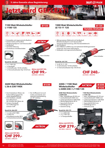 18 Die Ausstattung der Maschinen entspricht der %u00fcblichen Grundausstattung. Technische %u00c4nderungen, Preis%u00e4nderungen und Irrtum vorbehalten. Alle Preise verstehen sich als unverbindliche Preisempfehlung exkl. MwSt. + vRB.Aktion g%u00fcltig bis 31.03.2026Nur solange der Vorrat reicht3 Jahre Garantie ohne RegistrierungJetzt wird GEFLEXT!1100 Watt Winkelschleifer L 1100 125Bestell-Nr. 532.609%u0083 1x L 1100 125%u0083 1x Handgriff%u0083 1x Schutzhaube 125 %u00d8 schleifen%u0083 1x Trennschutzhaube Clip 125 %u00d8 mm%u0083 Kompakte und ergonomische Bauform%u0083 Extrem leicht und handlich%u0083 Wiederanlaufsperre nach Stromausfall%u0083 Sanftanlauf%u0083 Spindelarretierung%u0083 Arretierbarer Schiebeschalter%u00d8 125Bestell-Nr. 447.722%u0083 1x LE 15-11 125%u0083 1x Schutzhaube 125 %u00d8 schleifen%u0083 1x Trennschutzhaube Clip 125 %u00d8 mm1500 Watt Winkelschleifer LE 15-11 125%u0083 Mikroprozessor-Elektronik mit Sanftanlauf, Wiederanlaufsperre nach Stromausfall, Temperatur%u00fcberwachung, CDC-Konstantelektronik%u0083 Anti-Kickback%u0083 Eine effektive Luftf%u00fchrung und optimierte Kohlengeometrie sorgen f%u00fcr eine hohe Lebensdauer%u0083 Kompakte und ergonomische Bauform%u00d8 125Aktion statt CHF 145.%u2013CHF 99.%u2013exkl. MwSt. + vRB (0.56)CHF 240.%u2013exkl. MwSt. + vRB (0.56)*ohne Scheibe *ohne ScheibeVariable DrehzahlBestell-Nr. 532.779%u0083 1x L 2200 230%u0083 1x L 1100 125%u0083 1x Transportkoffer2200 / 1100%u00a0Watt Winkelschleifer L 2200 230 / L 1100 1252200 Watt Winkelschleifer L 2200 230 %u0083 Max. Schleifk%u00f6rper-%u00d8 230 mm%u0083 Leerlaufdrehzahl 6500 /min%u0083 Leistungsaufnahme 2200 Watt%u0083 Werkzeugaufnahme M 14%u0083 Spannhals-%u00d8 64 mm%u0083 Kabell%u00e4nge 4,0 m%u0083 Gewicht 5,8 kg1100 Watt Winkelschleifer L 1100 125%u0083 Max. Schleifk%u00f6rper-%u00d8 125 mm%u0083 Leerlaufdrehzahl 12000 /min %u0083 Leistungsaufnahme 1100 Watt%u0083 Werkzeugaufnahme M 14%u0083 Spannhals-%u00d8 40,3 mm%u0083 Kabell%u00e4nge 4,0 m%u0083 Gewicht 2,0 kg%u00d8 230%u00d8 125Bestell-Nr. 466.239%u0083 1x L 26-6 230 T-REX%u0083 1x SDS-Clic Schnellspannmutter M14%u0083 1x Diamanttrennscheibe2600 Watt Winkelschleifer L 26-6 230 T-REX%u0083 Hoch belastbarer Motor mit hohem Wirkungsgrad f%u00fcr starke Abgabeleistung%u0083 Anti-Kickback, schaltet beim Blockieren der Scheibe den Motor ab%u0083 Hinterer Handgriff mit Softeinlage f%u00fcr sicheren Griff%u0083 Der Griffbereich ist nach rechts und links f%u00fcr eine optimale Arbeitshaltung um 90%u00b0 drehbar.%u00d8 230Aktion statt CHF 583.%u2013CHF 299.%u2013exkl. MwSt. + vRB (2.31)Aktion statt CHF 475.%u2013CHF 279.%u2013exkl. MwSt. + vRB (2.31)