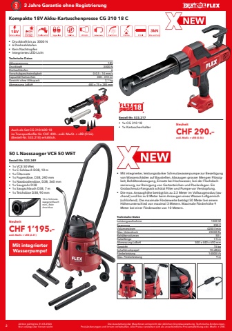 2 Die Ausstattung der Maschinen entspricht der %u00fcblichen Grundausstattung. Technische %u00c4nderungen, Preis%u00e4nderungen und Irrtum vorbehalten. Alle Preise verstehen sich als unverbindliche Preisempfehlung exkl. MwSt. + vRB.Aktion g%u00fcltig bis 31.03.2026Nur solange der Vorrat reicht3 Jahre Garantie ohne RegistrierungKompakte 18V Akku-Kartuschenpresse CG 310 18 C%u0083 Druckkraft bis zu 3000 N%u0083 6 Drehzahlstufen%u0083 Kein Nachtropfen%u0083 Integriertes LED-LichtBestell-Nr. 533.217%u0083 1x CG 310 18%u0083 1x KartuschenhalterTechnische DatenAkkuspannung 18VDruckkraft 3000 NDrehzahlstufen 6Vorschubgeschwindigkeit 0-0,5 - 14 mm/sKapazit%u00e4t Kartuschen 300 - 310 mlGewicht ohne Akkupack 2,1 kgAbmessung LxBxH 483 x 75 x 285 mmAuch als Set CG 310/600 18 im Transportkoffer f%u00fcr CHF 400.%u2013 exkl. MwSt. + vRB (0.56). (Bestell-Nr. 533.218) erh%u00e4ltlich.50 L Nasssauger VCE 50 WET Bestell-Nr. 533.349%u0083 1x VCE 50 Wet%u0083 1x C-Schlauch D38, 10 m%u0083 1x Filternetz%u0083 1x Fugend%u00fcse, D38, 240 mm%u0083 1x Nassbodend%u00fcse, D38, 360 mm%u0083 1x Saugrohr D38%u0083 1x Saugschlauch D38, 7 m%u0083 1x Teichd%u00fcse D38, 90 mm10 m Schmutzwasserschlauch mit C-Rohr AnschlussMit integrierter Wasserpumpe!NeuheitCHF 290.%u2013exkl. MwSt. + vRB (0.56)NeuheitCHF 1%u2019195.%u2013exkl. MwSt. + vRB (2.31)%u0083 Mit integrierter, leistungsstarker Schmutzwasserpumpe zur Beseitigung von Wassersch%u00e4den auf Baustellen, Absaugen grosser Mengen Fl%u00fcssigkeit, Beh%u00e4lterabsaugung, Einsatz bei Hochwasser, bei der Flachdachsanierung, zur Reinigung von Gartenteichen und Poolanlagen. Ein Grobschmutz-Fangsack sch%u00fctzt Filter und Pumpe vor Verstopfung.%u0083 Die max. Ansaugh%u00f6he betr%u00e4gt bis zu 2.3 Meter im Vollsaugmodus (tauchend) und bis zu 8 Meter beim Ansaugen eines Wasser-Luftgemisch (schl%u00fcrfend). Die maximale F%u00f6rderweite betr%u00e4gt 50 Meter bei einem H%u00f6henunterschied von maximal 3 Metern. Maximale F%u00f6rderh%u00f6he 9 Meter bei einer F%u00f6rderweite von 10 Metern.Technische DatenLeistungsaufnahme 1300 WSpannung 230 VVolumenstrom 4200 l/minMax. Unterdruck 23000 PaBeh%u00e4ltervolumen 50 LKabell%u00e4nge 7.5 mAbmessung LxBxH 500 x 440 x 650 mmGewicht 15 kgSchalldruckpegel 70 dB(A)F%u00f6rderleistung 14000 l/hMax. F%u00f6rderleistung 9 m