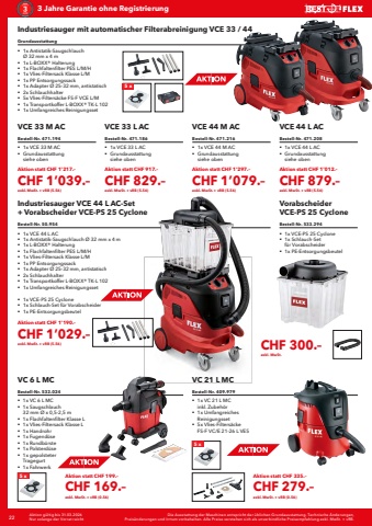 22 Die Ausstattung der Maschinen entspricht der %u00fcblichen Grundausstattung. Technische %u00c4nderungen, Preis%u00e4nderungen und Irrtum vorbehalten. Alle Preise verstehen sich als unverbindliche Preisempfehlung exkl. MwSt. + vRB.Aktion g%u00fcltig bis 31.03.2026Nur solange der Vorrat reicht3 Jahre Garantie ohne RegistrierungVCE 33 M ACIndustriesauger mit automatischer Filterabreinigung VCE 33 / 44VCE 33 L AC VCE 44 M AC VCE 44 L ACGrundausstattung%u0083 1x Antistatik-Saugschlauch %u00d8 32 mm x 4 m%u0083 1x L-BOXX%u00ae Halterung%u0083 1x Flachfaltenfilter PES L/M/H%u0083 1x Vlies-Filtersack Klasse L/M%u0083 1x PP Entsorgungssack%u0083 1x Adapter %u00d8 25-32 mm, antistatisch%u0083 2x Schlauchhalter%u0083 5x Vlies-Filters%u00e4cke FS-F VCE L/M %u0083 1x Transportkoffer L-BOXX%u00ae TK-L 102%u0083 1x Umfangreiches ReinigungssetBestell-Nr. 471.194%u0083 1x VCE 33 M AC%u0083 Grundausstattung siehe obenBestell-Nr. 471.216%u0083 1x VCE 44 M AC%u0083 Grundausstattung siehe obenBestell-Nr. 471.186%u0083 1x VCE 33 L AC%u0083 Grundausstattung siehe obenBestell-Nr. 471.208%u0083 1x VCE 44 L AC%u0083 Grundausstattung siehe obenBestell-Nr. 50.954%u0083 1x VCE 44 L AC%u0083 1x Antistatik-Saugschlauch %u00d8 32 mm x 4 m%u0083 1x L-BOXX%u00ae Halterung%u0083 1x Flachfaltenfilter PES L/M/H%u0083 1x Vlies-Filtersack Klasse L/M%u0083 1x PP Entsorgungssack%u0083 1x Adapter %u00d8 25-32 mm, antistatisch%u0083 2x Schlauchhalter%u0083 1x Transportkoffer L-BOXX%u00ae TK-L 102%u0083 1x Umfangreiches Reinigungsset%u0083 1x VCE-PS 25 Cyclone%u0083 1x Schlauch-Set f%u00fcr Vorabscheider%u0083 1x PE-EntsorgungsbeutelIndustriesauger VCE 44 L AC-Set + Vorabscheider VCE-PS 25 CycloneVorabscheider VCE-PS 25 CycloneBestell-Nr. 533.294%u0083 1x VCE-PS 25 Cyclone%u0083 1x Schlauch-Set f%u00fcr Vorabscheider%u0083 1x PE-Entsorgungsbeutel5 xBestell-Nr. 409.979%u0083 1x VC 21 L MC inkl. Zubeh%u00f6r%u0083 1x Umfangreiches Reinigungsset%u0083 5x Vlies-Filters%u00e4cke FS-F VC/E 21-26 L VE5VC 6 L MC VC 21 L MCBestell-Nr. 532.024%u0083 1x VC 6 L MC%u0083 1x Saugschlauch 32 mm %u00d8 x 0,5-2,5 m%u0083 1x Flachfaltenfilter Klasse L%u0083 1x Vlies-Filtersack Klasse L%u0083 1x Handrohr%u0083 1x Fugend%u00fcse%u0083 1x Rundb%u00fcrste%u0083 1x Polsterd%u00fcse%u0083 1x gepolsteter Tragegurt%u0083 1x Fahrwerk5 x5 xAktion statt CHF 1%u2019217.%u2013CHF 1%u2019039.%u2013exkl. MwSt. + vRB (5.56)Aktion statt CHF 917.%u2013CHF 829.%u2013exkl. MwSt. + vRB (5.56)Aktion statt CHF 1%u2019297.%u2013CHF 1%u2019079.%u2013exkl. MwSt. + vRB (5.56)Aktion statt CHF 1%u2019012.%u2013CHF 879.%u2013exkl. MwSt. + vRB (5.56)Aktion statt CHF 1%u2019190.%u2013CHF 1%u2019029.%u2013exkl. MwSt. + vRB (5.56) CHF 300.%u2013exkl. MwSt. Aktion statt CHF 199.%u2013CHF 169.%u2013exkl. MwSt. + vRB (0.56)Aktion statt CHF 335.%u2013CHF 279.%u2013exkl. MwSt. + vRB (0.56)