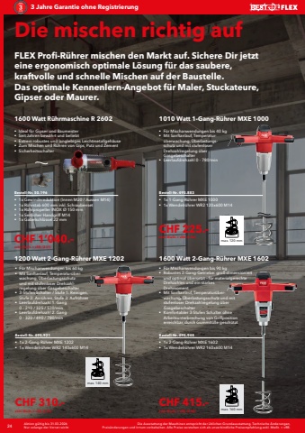 24 Die Ausstattung der Maschinen entspricht der %u00fcblichen Grundausstattung. Technische %u00c4nderungen, Preis%u00e4nderungen und Irrtum vorbehalten. Alle Preise verstehen sich als unverbindliche Preisempfehlung exkl. MwSt. + vRB.Aktion g%u00fcltig bis 31.03.2026Nur solange der Vorrat reicht3 Jahre Garantie ohne RegistrierungDie mischen richtig aufFLEX Profi-R%u00fchrer mischen den Markt auf. Sichere Dir jetzt eine ergonomisch optimale L%u00f6sung f%u00fcr das saubere, kraftvolle und schnelle Mischen auf der Baustelle. Das optimale Kennenlern-Angebot f%u00fcr Maler, Stuckateure, Gipser oder Maurer.1600 Watt 2-Gang-R%u00fchrer MXE 1602%u0083 F%u00fcr Mischanwendungen bis 90 kg %u0083 Robustes 2-Gang-Getriebe: gro%u00df dimensioniert und optimal %u00fcbersetzt %u2013 f%u00fcr materialgerechte Drehzahlen und ein starkes Drehmoment%u0083 Mit Sanftanlauf, Temperatur%u00fcberwachung, %u00dcberlastungsschutz und mit stufenloser Drehzahlregelung %u00fcber Gasgebeschalter%u0083 Komfortabler 3-Stufen Schalter ohne Arbeitsunterbrechung von Griffposition erreichbar, durch Gummit%u00fclle gesch%u00fctztmax. 160 mm1600 Watt R%u00fchrmaschine R 2602%u0083 Ideal f%u00fcr Gipser und Baumeister%u0083 Seit Jahren bew%u00e4hrt und beliebt%u0083 Extrem robustes und langlebiges Leichtmetallgeh%u00e4use%u0083 Zum Mischen und R%u00fchren von Gips, Putz und Zement%u0083 Sicherheitsschalter1200 Watt 2-Gang-R%u00fchrer MXE 1202%u0083 F%u00fcr Mischanwendungen bis 60 kg%u0083 Mit Sanftanlauf, Temperatur%u00fcberwachung, %u00dcberlastungsschutz und mit stufenloser Drehzahlregelung %u00fcber Gasgebeschalter %u0083 3-Stufen Schalter / Stufe 1: Reinigen, Stufe 2: Anr%u00fchren, Stufe 3: Aufr%u00fchren%u0083 Leerlaufdrehzahl 1. Gang 0 - 210 / 325 / 530/min%u0083 Leerlaufdrehzahl 2. Gang 0 - 320 / 490 / 780/minmax. 140 mm1010 Watt 1-Gang-R%u00fchrer MXE 1000%u0083 F%u00fcr Mischanwendungen bis 40 kg %u0083 Mit Sanftanlauf, Temperatur%u00fcberwachung, %u00dcberlastungsschutz und mit stufenloser Drehzahlregelung %u00fcber Gasgebeschalter %u0083 Leerlaufdrehzahl 0 - 780/minmax. 120 mmBestell-Nr. 495.921%u0083 1x 2-Gang-R%u00fchrer MXE 1202%u0083 1x Wendelr%u00fchrer WR2 140x600 M14Bestell-Nr. 495.948%u0083 1x 2-Gang-R%u00fchrer MXE 1602%u0083 1x Wendelr%u00fchrer WR2 160x600 M14Bestell-Nr. 495.883%u0083 1x 1-Gang-R%u00fchrer MXE 1000%u0083 1x Wendelr%u00fchrer WR2 120x600 M14Bestell-Nr. 50.196%u0083 1x Gewindereduktion (Innen M20 / Aussen M14)%u0083 1x R%u00fchrstab 600 mm inkl. Schraubenset%u0083 1x R%u00fchrpropeller INOX %u00d8 150 mm%u0083 1x Seitlicher Handgriff M14%u0083 1x Gabelschl%u00fcssel 22 mmCHF 225.%u2013exkl. MwSt. + vRB. (0.56)CHF 415.%u2013exkl. MwSt. + vRB. (0.56)CHF 310.%u2013exkl. MwSt. + vRB. (0.56)CHF 1%u2019040.%u2013exkl. MwSt. + vRB. (2.31)