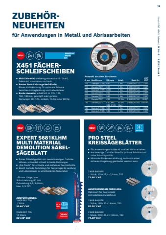 2%u2005608%u2005846%u20058601 St%u00fcck; 203%u2009%u00d725,4%u2009%u00d7%u20092,0%u2009mm, T4271.40* CHF AUSF%u00dcHRUNGEN CORDLESS: Optimiert f%u00fcr den Einsatz mit kabellosen Maschinen2%u2005608%u2005846%u20058581 St%u00fcck; 165%u2009%u00d7%u200920%u2009%u00d7%u20091,6%u2009mm, T4057.20* CHF2%u2005608%u2005846%u20058591 St%u00fcck; 203%u2009%u00d7%u200925,4%u2009%u00d7%u20091,8%u2009mm, T4271.40* CHFZUBEH%u00d6RNEUHEITENf%u00fcr Anwendungen in Metall und Abrissarbeiten X451 F%u00c4CHERSCHLEIFSCHEIBEN%u25fe Multi Material: vielseitig einsetzbar f%u00fcr Stahl, Edelstahl, Aluminium und Holz%u25fe Bestes Preis-Leistungs-Verh%u00e4ltnis: Blaue ALOX-K%u00f6rnung f%u00fcr optimale Balance zwischen Abtragleistung und Lebensdauer%u25fe Breite Auswahl: erh%u00e4ltlich in 115, 125, 150, 180%u2009mm, gekr%u00f6pft oder gerade, K%u00f6rnungen 40%u2013120, einzeln, 15-tlg. oder 60-tlg.%u2300 mm Ausf%u00fchrung K%u00f6rnung Inhalt Best.-Nr.UVP CHF115 Gekr%u00f6pft (T29) K40 1 Stk. 2 608 626 122 2.45*115 Gerade (T27) K80 1 Stk. 2 608 626 134 2.45*125 Gekr%u00f6pft (T29) K120 1 Stk. 2%u2005608%u2005626 144 2.65*125 Gerade (T27) K60 1 Stk. 2%u2005608%u2005626%u2005148 2.65*125 Gerade (T27) K80 1 Stk. 2%u2005608%u2005626%u2005150 2.65*125 Gerade (T27) K60 15 Stk. 2%u2005608%u2005626%u2005180 39.83*125 Gerade (T27) K40, K60, K80, K12060 Stk. (Set)2%u2005608%u2005626 164 159.35*150 Gekr%u00f6pft (T29) K60 1 Stk. 2%u2005608%u2005626%u2005154 3.95*180 Gekr%u00f6pft (T29) K80 1 Stk. 2%u2005608%u2005626%u2005158 5.30*PRECISIONPRO STEEL KREISS%u00c4GEBL%u00c4TTER%u25fe F%u00fcr Anwendungen in Metall und bei Abrissarbeiten %u25fe Hochwertige Carbidez%u00e4hne f%u00fcr pr%u00e4zise Schnitte und hohe Schnittqualit%u00e4t%u25fe Minimale Funkenentwicklung, sodass in einer sicheren Umgebung gearbeitet werden kannAuswahl aus dem Sortiment:EXPERT S681KLHM MULTI MATERIAL DEMOLITION S%u00c4BELS%u00c4GEBLATT%u25fe Erstes S%u00e4bels%u00e4geblatt mit zweischneidigen Carbidez%u00e4hnen: schneidet schnell in beide Richtungen%u25fe %u201eRip Tooth%u201c f%u00fcr schnelle und m%u00fchelose Tauchschnitte%u25fe Bosch Carbide Technology f%u00fcr hervorragende Leistung und Lebensdauer in verschiedenen Materialien150 mm L%u00e4nge, max. Schnittleistung 80 mmZahnteilung 6,4%u2009/ 8,0%u2009mm, bzw. 3%u2009/%u20094 TPIAUSF%u00dcHRUNGEN: 2%u2005608%u2005901%u20057041 St%u00fcck32.60* CHF2%u2005608%u2005901%u200570510 St%u00fcck261.00* CHFNEU! NEU!NEU!Bosch PRO NEWS Schweiz | 01.09.%u2009%u2013%u200931.12.2025 | Tertial 313